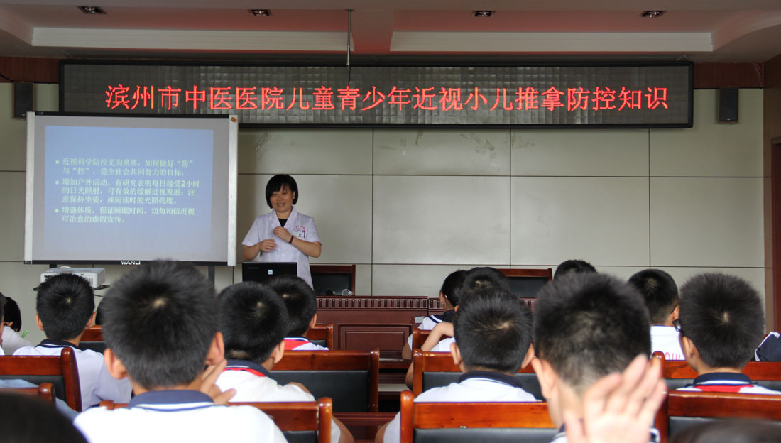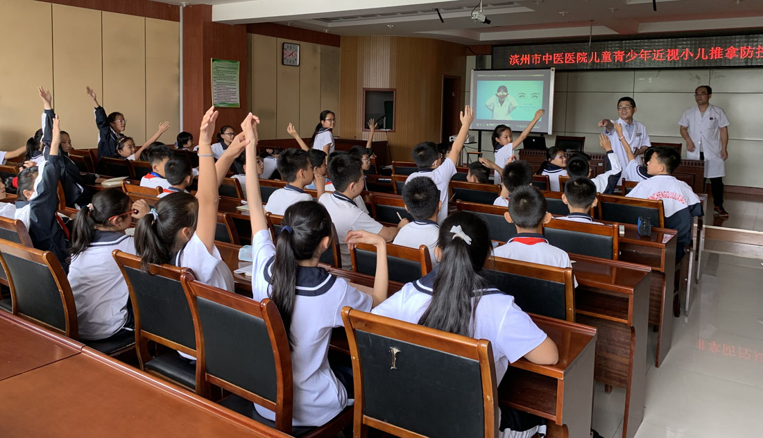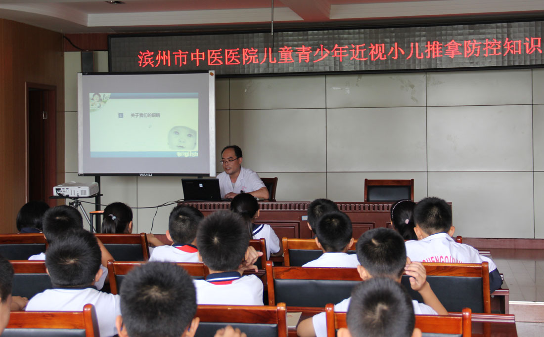 2019年4月,滨州市中医医院被山东省卫健委、省中医药管理局挂牌授予“市级儿童青少年近视小儿推拿防控基地”,我院将继续结合中医特色,针对中小学生眼部问题特点开展推拿、针灸、耳穴压豆等中医特色疗法,为孩子们的眼睛健康保驾护航。