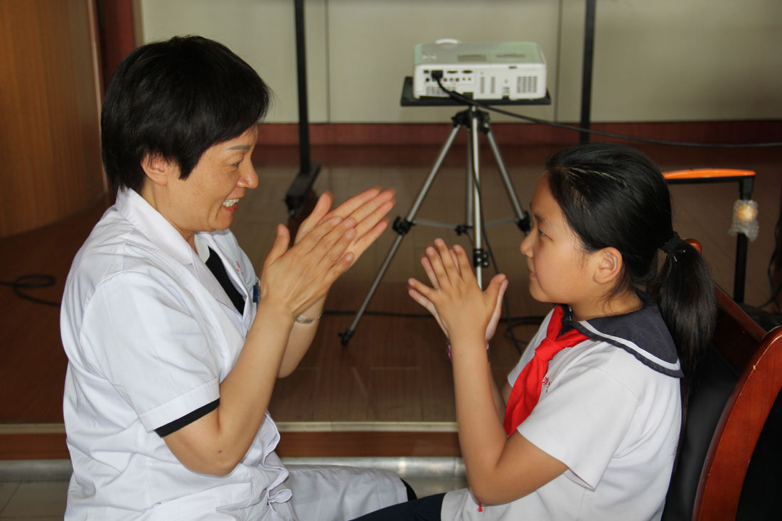 随后,孔庆雪、陈秀霞、王帅帅三位医师现场给孩子们进行眼部的保健推拿方法,将简单易操作的近视预防方法向学生们进行演示和讲解。