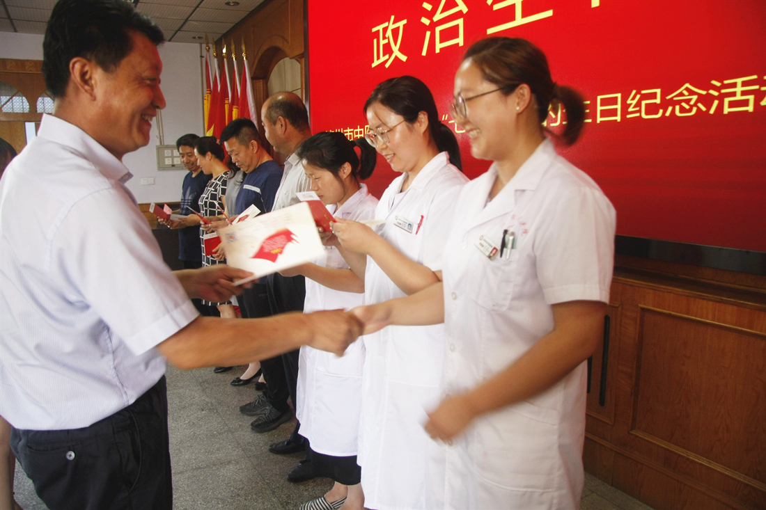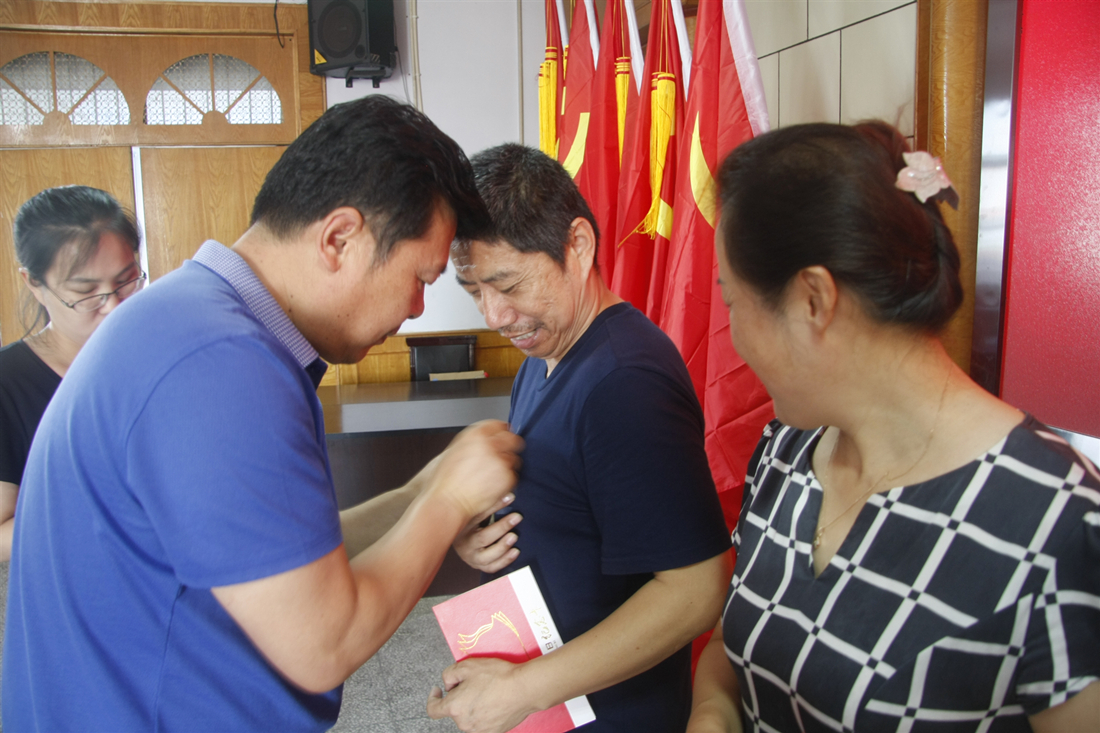 党总支副书记、院长高金昌为过“政治生日”的党员佩戴新党徽。