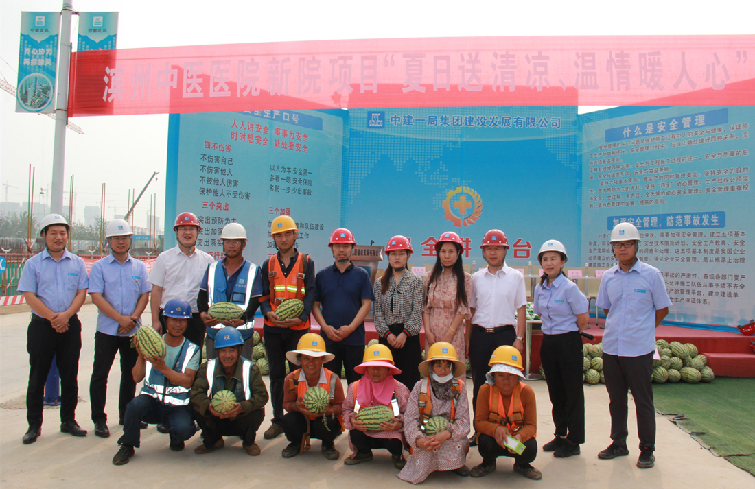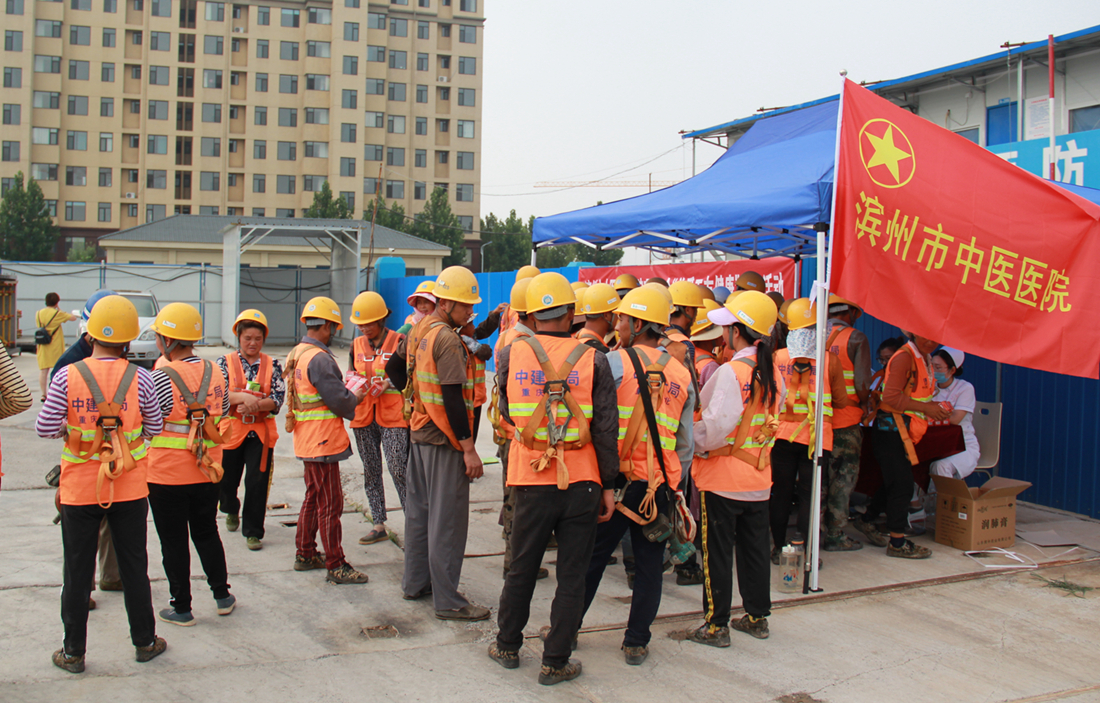 7月11日,中建一局于滨州市中医医院新院建设工地组织“夏日送清凉、温情暖人间”活动,我院也委派医护人员同步举行“关爱工友健康”义诊活动。滨州市中医医院副院长卢海波、彭李街道副主任张立立、中建一局工会副主席姜鹏等人出席了活动。