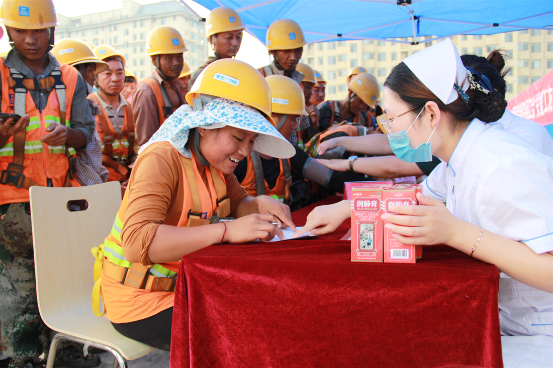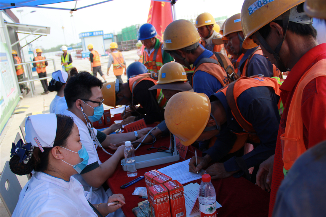 我院新院建设开工已有半年时间,目前,工程底板施工阶段已接近尾声。在这炎炎夏日,为感谢广大工友和工程管理人员的辛勤劳动,我院医护人员现场进行中医体质辨证论治,并针对健康咨询解答疑问,为广大工友提供免费推拿、测量血压等中医特色服务。同时,联合山东省红十字会,为呼吸系统不适的工友们赠送润肺膏。