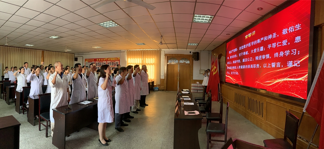 颁奖典礼结束后,副院长杨艳红带领全体医师郑重宣誓:自觉维护医学的尊严和神圣,敬佑生命,平等仁爱,患者至上,真诚友善,精进审慎,廉洁公正,终身学习,努力担当增进人类健康的崇高职责。凝聚着全体医师对医学的热爱和不懈追求,承载着对生命的慈悲和怜悯,一声声铿锵有力的誓词在大厅回响。