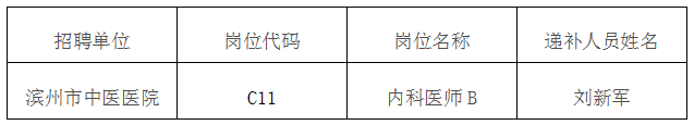 根据《滨州市2019年度市直公立医院公开招聘高层次和紧缺专业人才简章》关于“对放弃考察、体检资格或者考察、体检不合格造成的空缺,按面谈交流成绩或专业测试成绩依次递补”的规定,现将2019年滨州市中医医院公开招聘高层次和紧缺专业人才递补体检考察人选予以公告。
