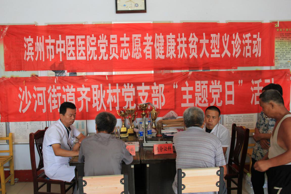 7月26日,由滨州市中医医院行政后勤党支部带队,脾胃病科、内分泌科、脑病科、急诊科、健康管理中心、检验科共11名党员志愿者组成的医疗服务队,一早前往我院科教科燕玉敏主任所在的万名干部下基层服务队——沙河齐耿村委会,为齐耿、打渔张、小安定、于新、码头5个村的贫困户、低保户开展了“精准扶贫、送医下乡”义诊服务活动。