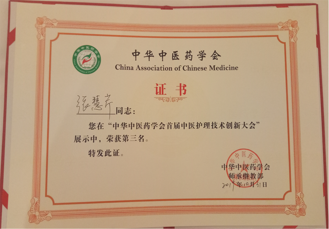 为推动中医护理学科发展,提升中医护理服务质量,进一步深化落实中医护理的传承与创新,调动中医护理工作者的积极性和创造性,由中华中医药学会主办,“第十七次学术交流会暨中医护理技术创新大会”于2019年10月30日——11月2日在福建省福州市召开。经过激烈角逐,我院选手张慧芹最终获得全国首届中医护理技术创新大赛第三名。