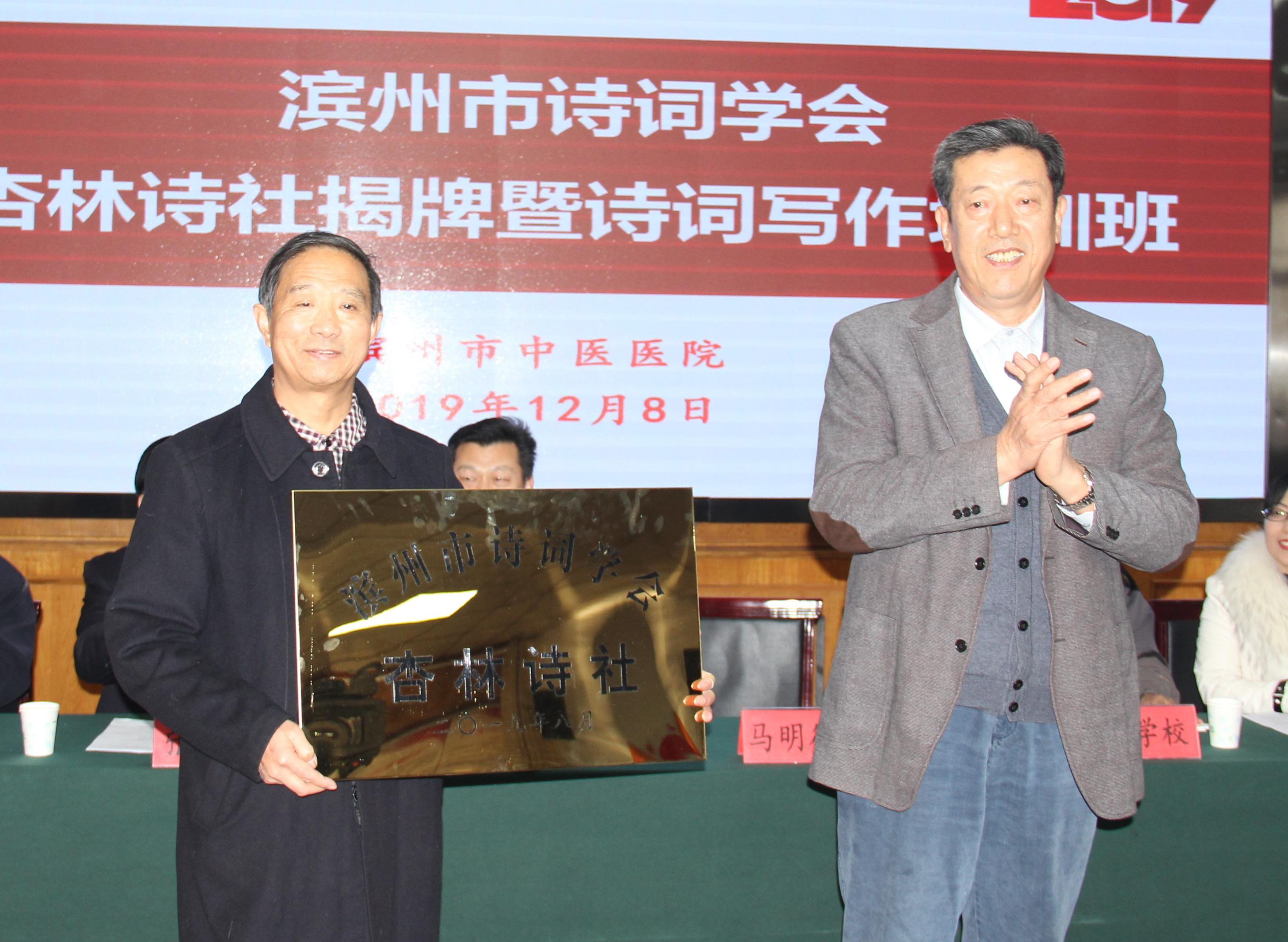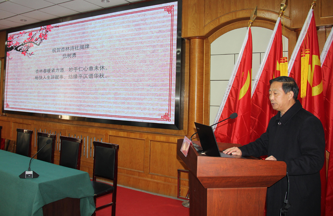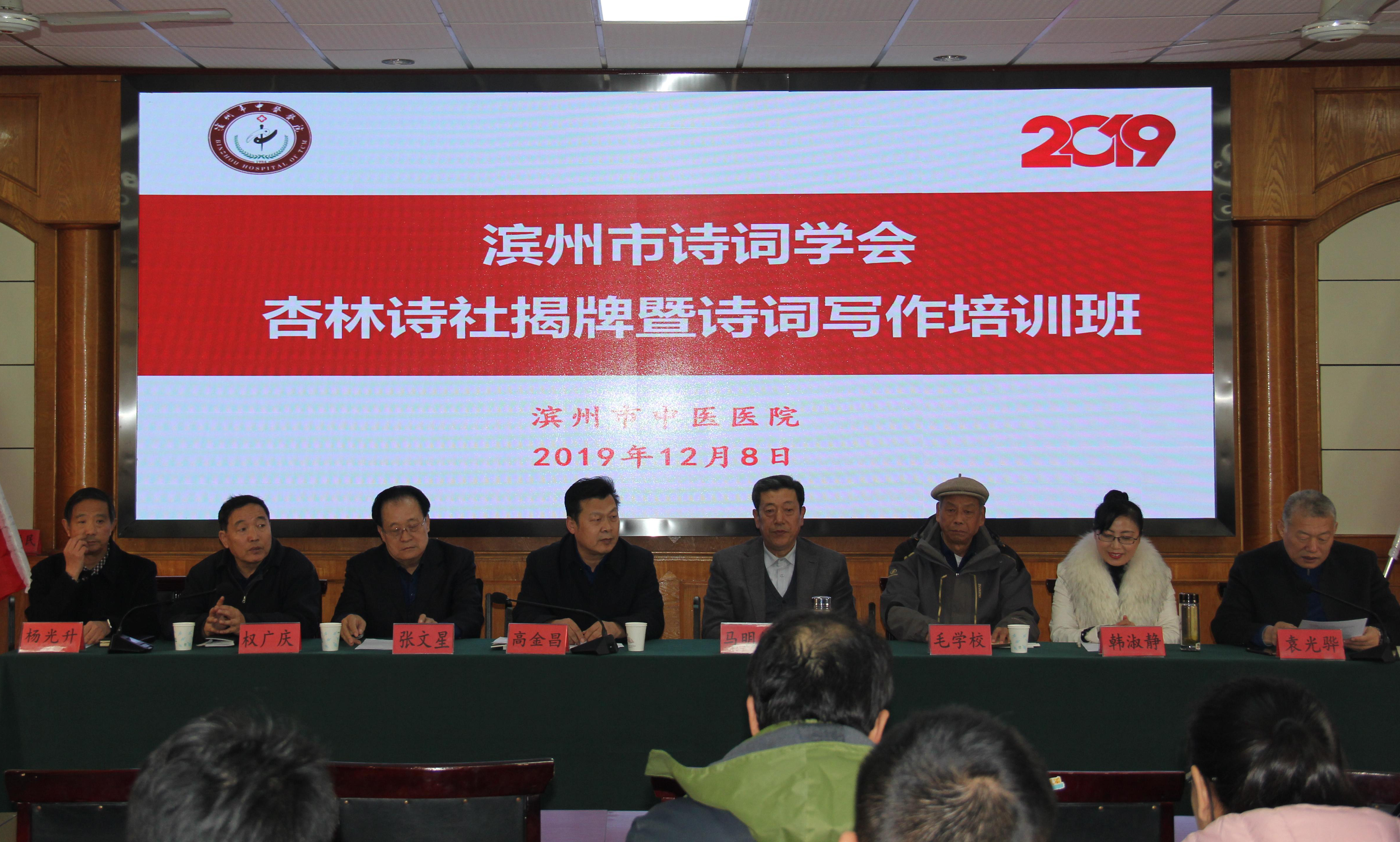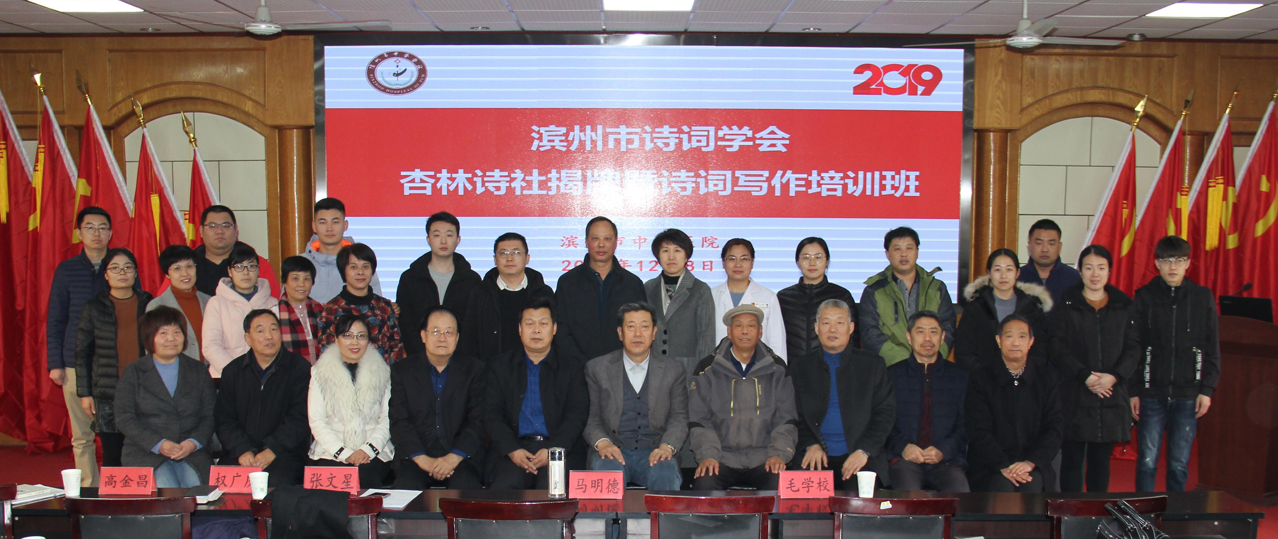 2019年12月8日,滨州市诗词学会杏林诗社揭牌仪式暨第一期诗词写作培训班在滨州市中医医院门诊楼四楼会议室顺利举行。山东省诗词学会常务理事、山东老干部诗词学会副会长、滨州市诗词学会会长马明德,滨州市诗词学会副会长毛学校,山东诗词学会理事、滨州市诗词学会副会长张文星,山东诗词学会理事、滨州市诗词学会副秘书长韩淑静,滨州市诗词学会办公室副主任权广庆,滨州市中医医院党总支副书记、院长高金昌,党总支副书记、工会主席袁光骅,副院长杨艳红,副院长卢海波,工会副主席、杏林诗社社长杨光升,杏林诗社副社长吉洪花出席会议。市中医医院党总支副书记、工会主席袁光骅主持。来自杏林诗社的四十多位诗友参加了培训。