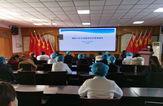 门诊预检分诊是医疗机构疫情防控的第一关口,为严格落实《山东省医疗机构预检分诊流程和穿脱防护用品流程的通知》要求,进一步做好新冠病毒预检分诊工作,有效控制医院交叉感染,3月2日下午,在门诊楼四楼会议室,我院护理部组织进行了预检分诊工作规范、工作流程的相关培训及演练工作。