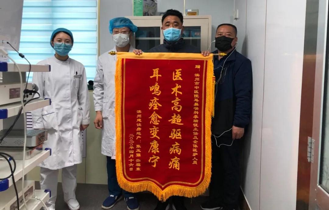 “真心感谢李主任及全体医护人员,你们高超的医术,治好了困扰我许久的耳鸣,真心感谢。”近日,在滨州市中医医院耳鼻喉科病房,患者张先生把一面写有“医术高超驱痛痛,耳鸣痊愈变康宁”的锦旗送到李瑞征主任手中。