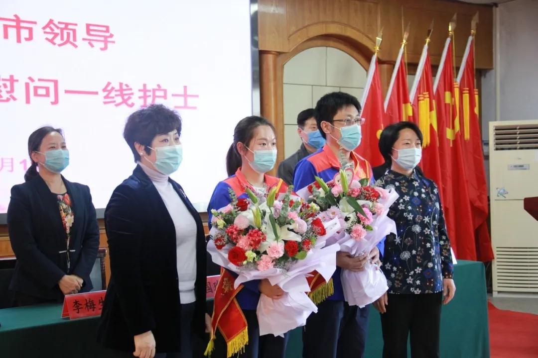 随后,市政协副主席吴国瑞,市政协教科卫体委副主任谷玉玲为驰援湖北一线的两位医护人员送上了鲜花,感谢他们在此次新冠肺炎疫情防控工作中的英勇付出与无私奉献。并希望他们在今后工作中继续努力,开拓进取,为人民群众提供更全面、更优质、更周到的护理服务,为保障群众的生命健康贡献力量。