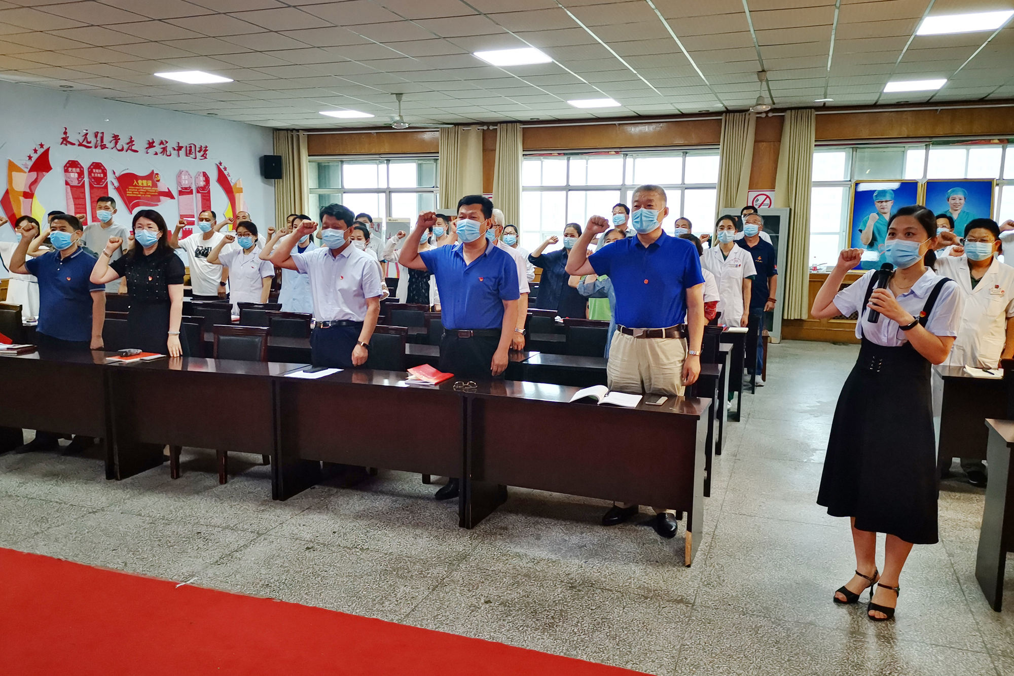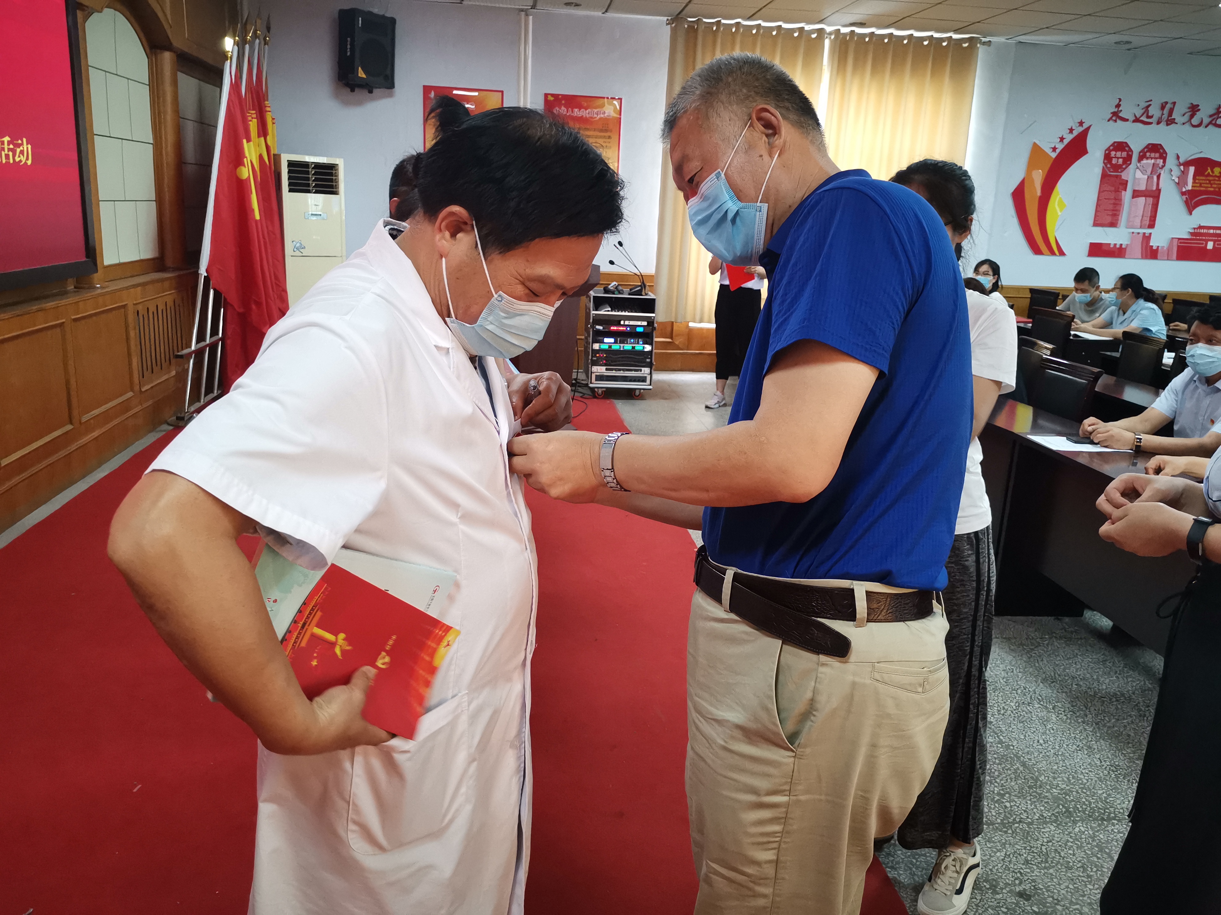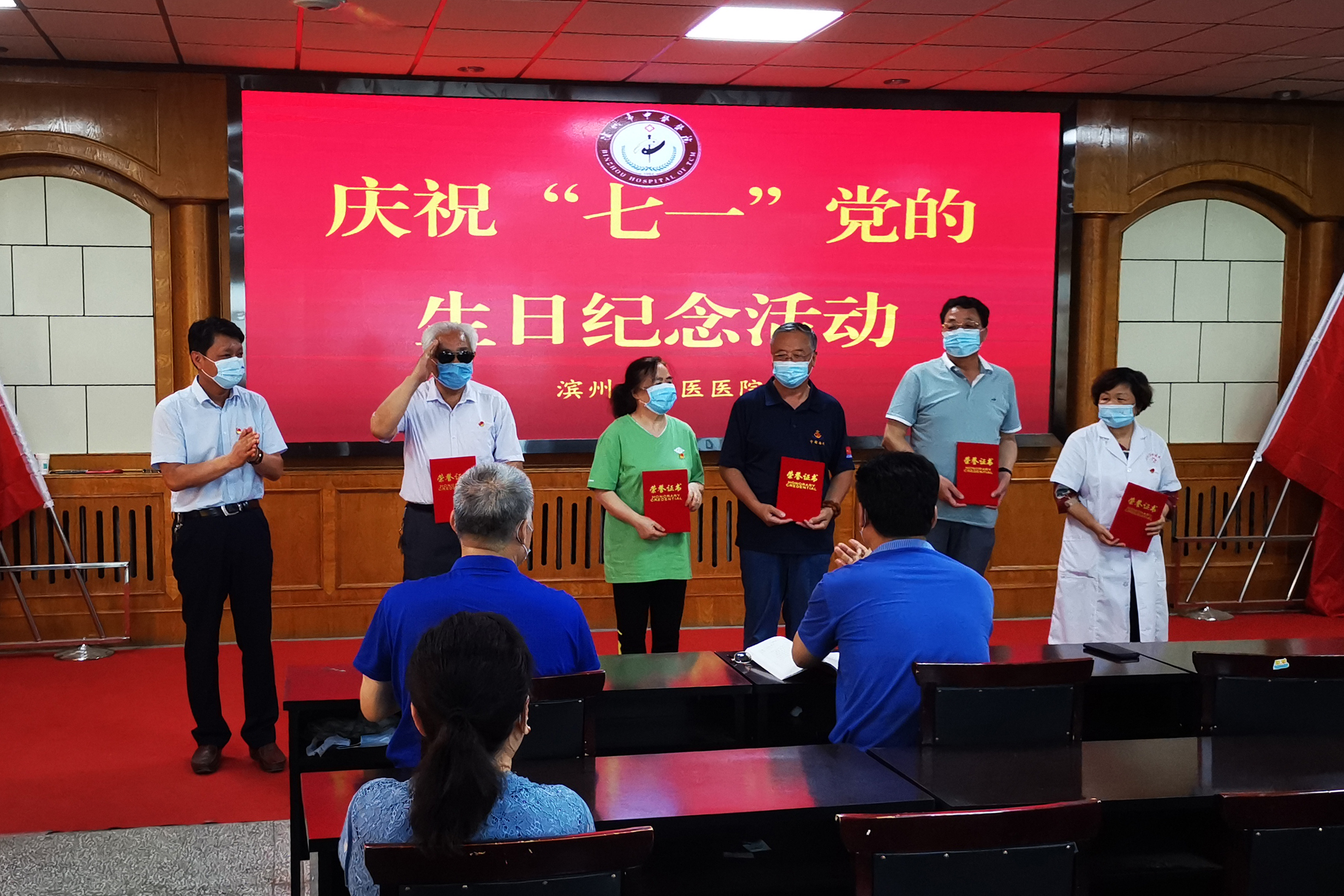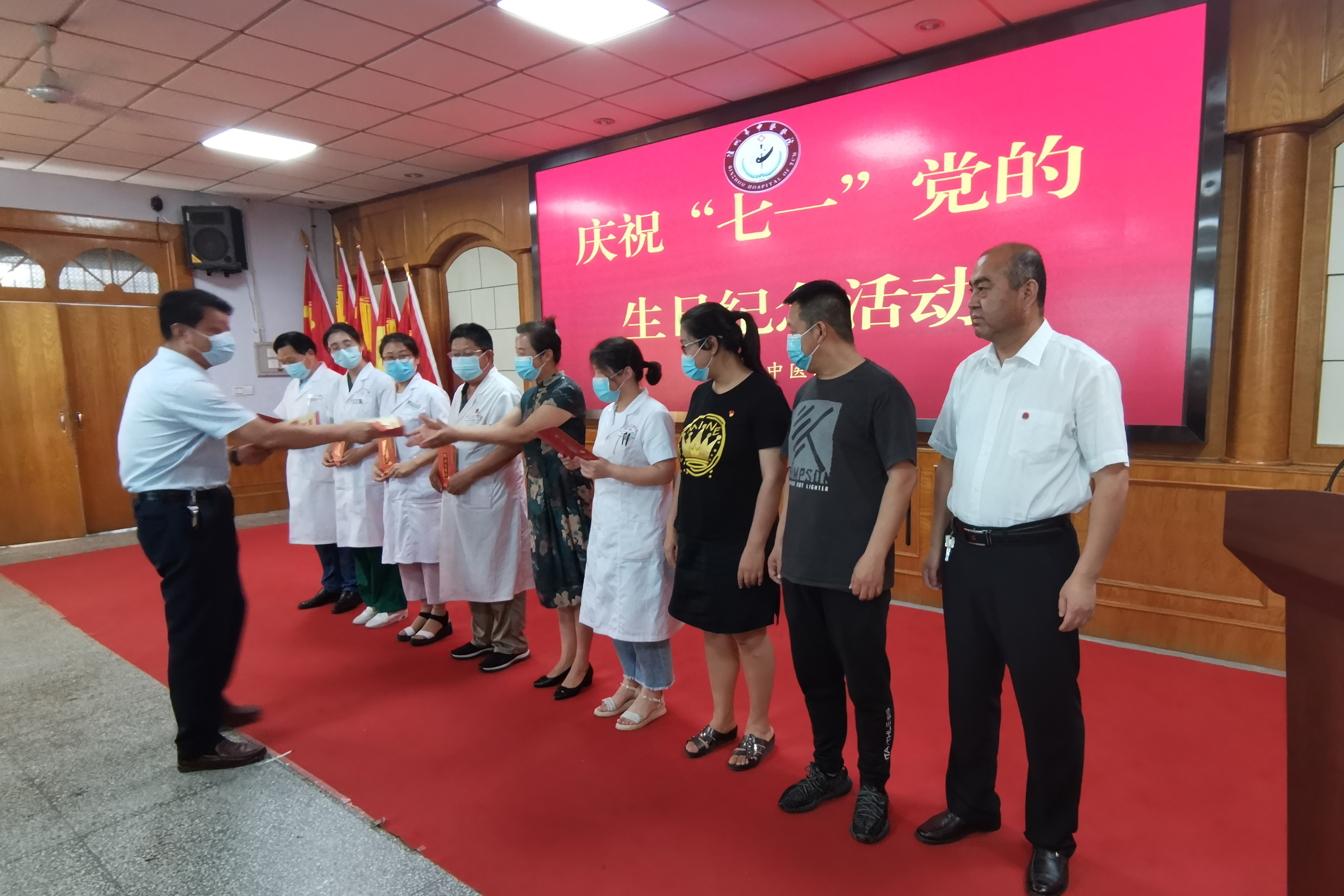 下午3:00,全体党员在门诊楼四楼会议室举办了庆祝“七一”党的生日纪念活动。活动中为退休老党员颁发了“2019年度优秀共产党员”荣誉证书,同时为上半年入党的同志发放政治生日贺卡、书籍并佩戴党徽。最后全体党员重温入党誓词,回忆入党初心。