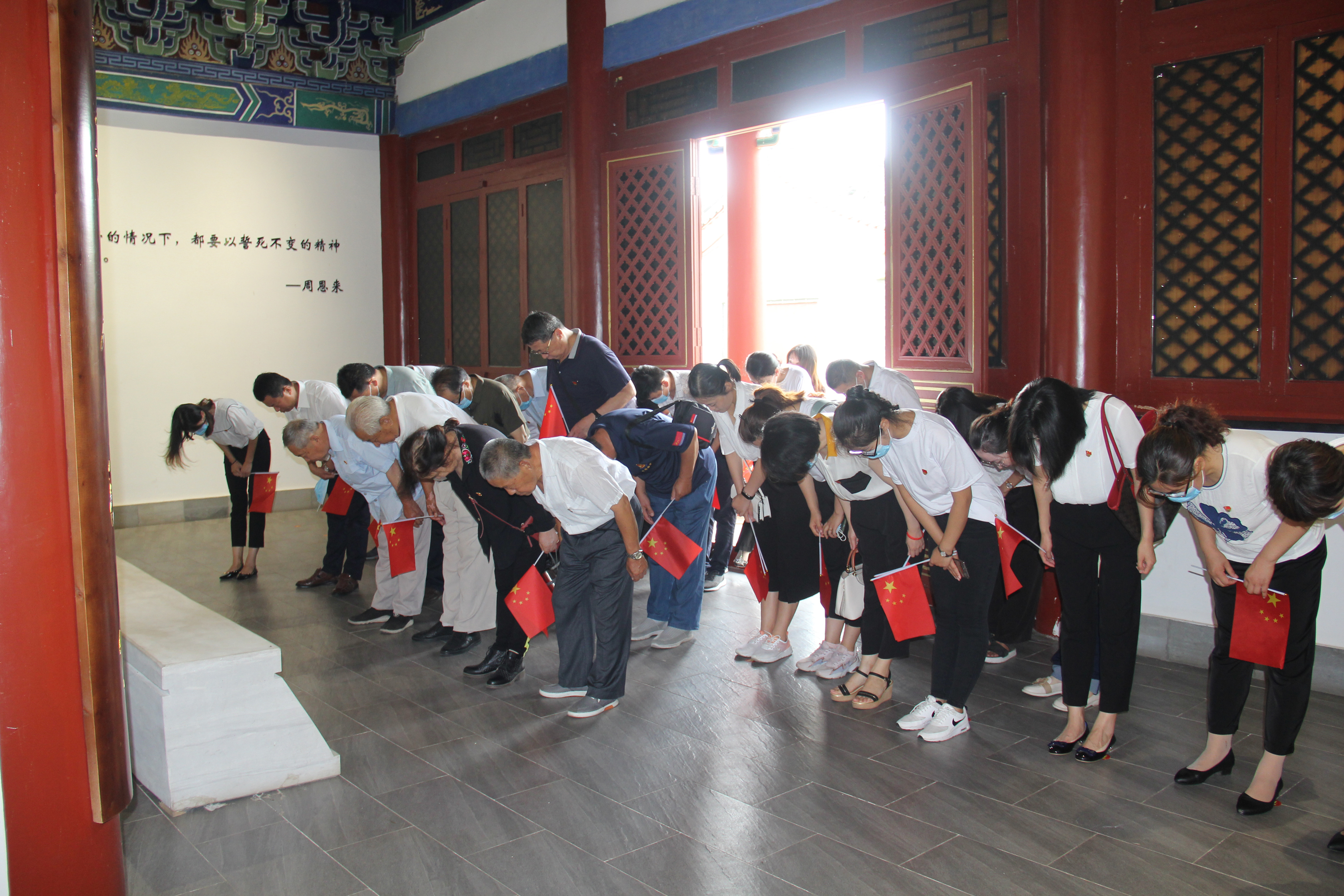 为增强党员党性修养,创新党支部组织生活形式,2020年7月23日,滨州市中医医院行政后勤党支部、医疗党支部以及老干部党支部的党员代表,在院长高金昌同志和党总支副书记袁光骅同志带队下,共同怀着对周恩来总理的崇高敬意前往怀周祠和杨柳雪不忘初心教育基地进行党性教育。