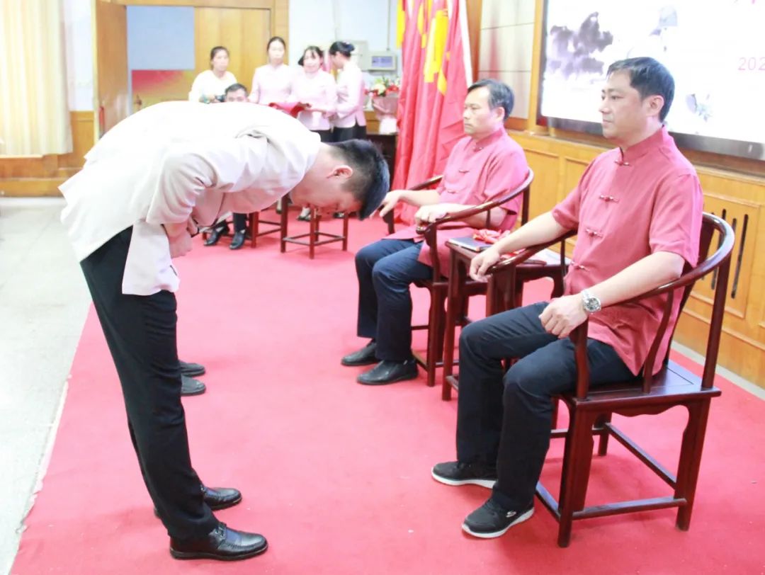 崔智峰、刘志夫行拜师礼:鞠躬,并分别向师父献茶