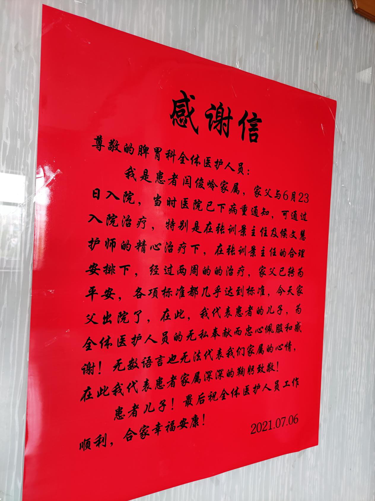 【致谢信函】来自脾胃病科患者的一封感谢信 “患者性命相托 我必全力以赴”