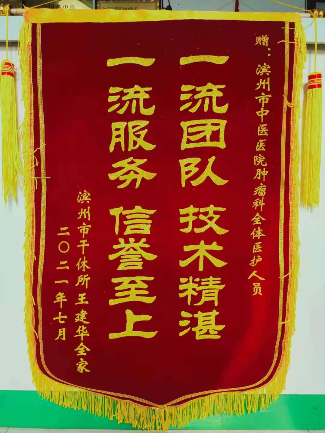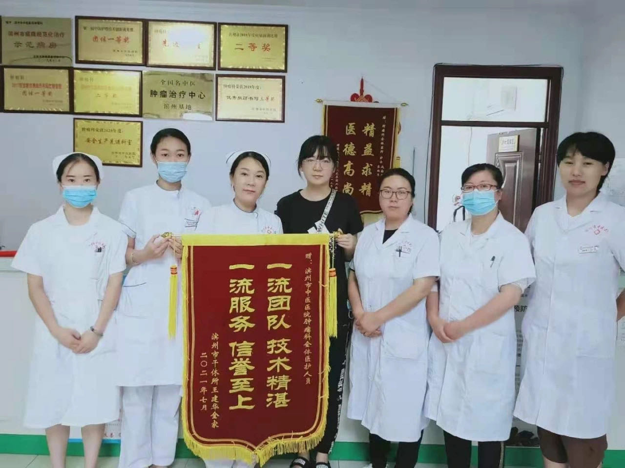 2021年7月29日14:30分,滨州市中医院的肿瘤科病房和往日一样,工作人员在有条不紊的忙碌着,走廊里有几位闲聊的患者和家属。这时候一位温文尔雅的姑娘端着一面锦旗来到护士站,护士们认出来,是我们科7月26日因胰腺癌多发性淋巴转移去世的王建华大叔的女儿。王建华老人的女儿把锦旗交到我手里,声音很低:“护士长,感谢你们这么用心地照顾我爸,从济南住院时,那边的医生说我爸的病熬不过4月,没想到在你们的精心治护下,老人能走到现在。后期变得平静、乐观了,给了我们时间能陪伴他到现在,全家人感激你们的付出。”