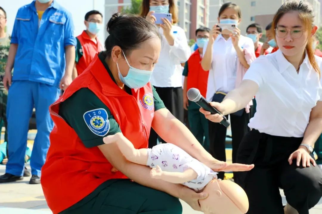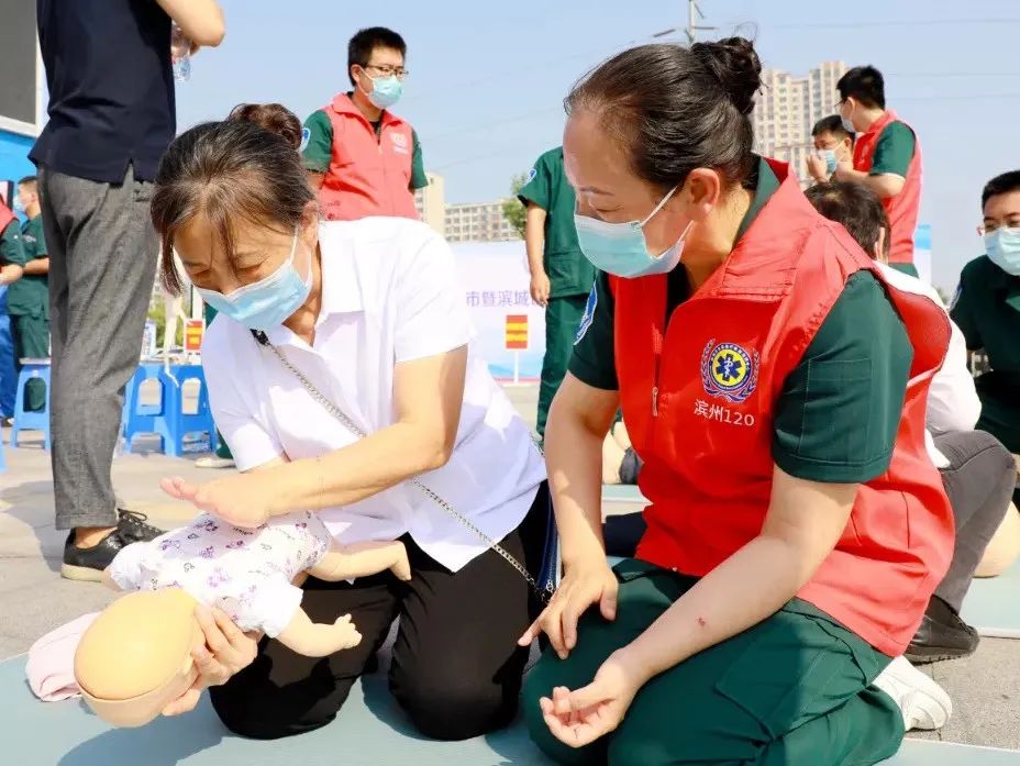 活动现场有心肺复苏、创伤包扎、气管异物、AED使用等急救操作技能展示,滨州市中医医院急诊科急救人员演示了幼儿及成人海姆立克急救法,通过现场示范教学,讲解气道异物梗阻救护知识,指导群众实践操作,互动气氛热烈,宣讲生动且有实用价值,切实达到“人人学急救,急救为人人”的目的。