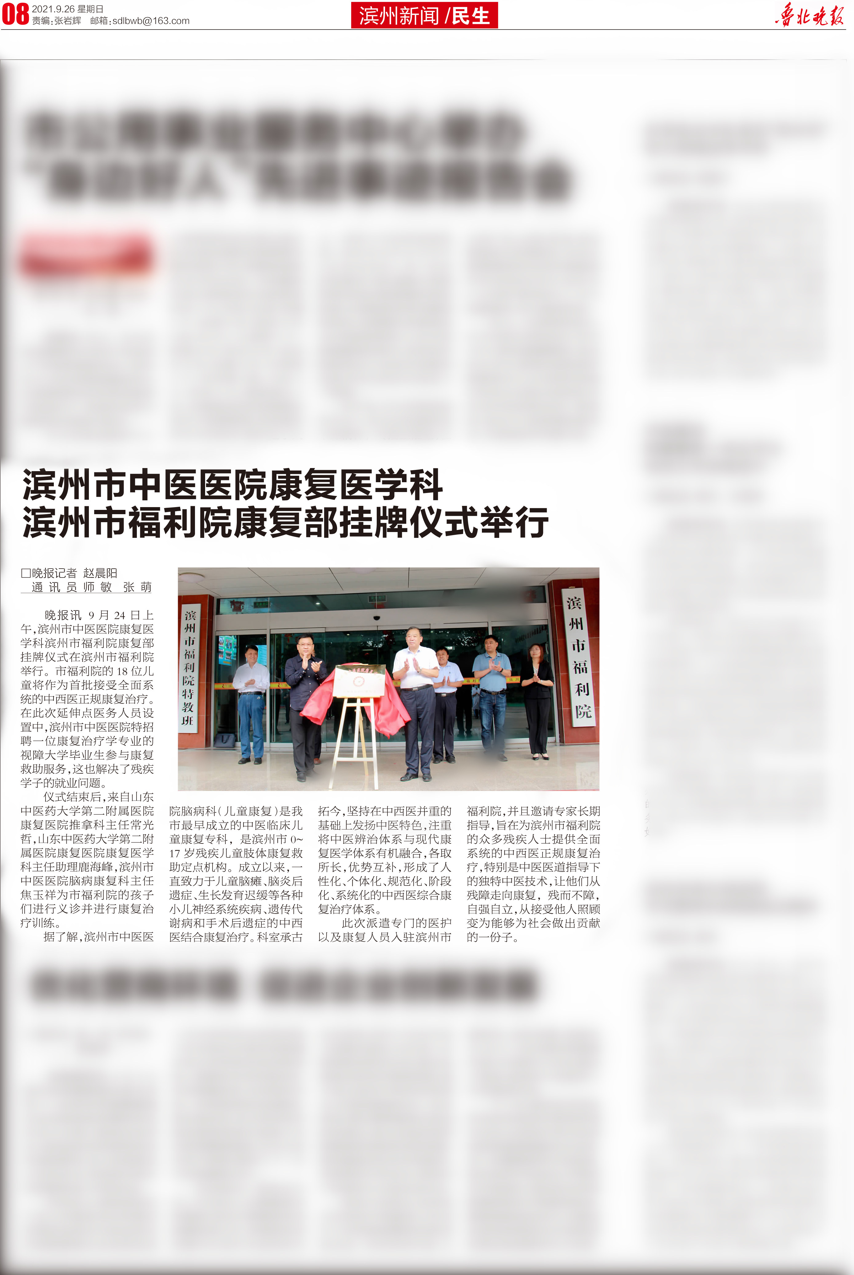 【鲁北晚报】滨州市中医医院康复医学科滨州市福利院康复部挂牌仪式举行