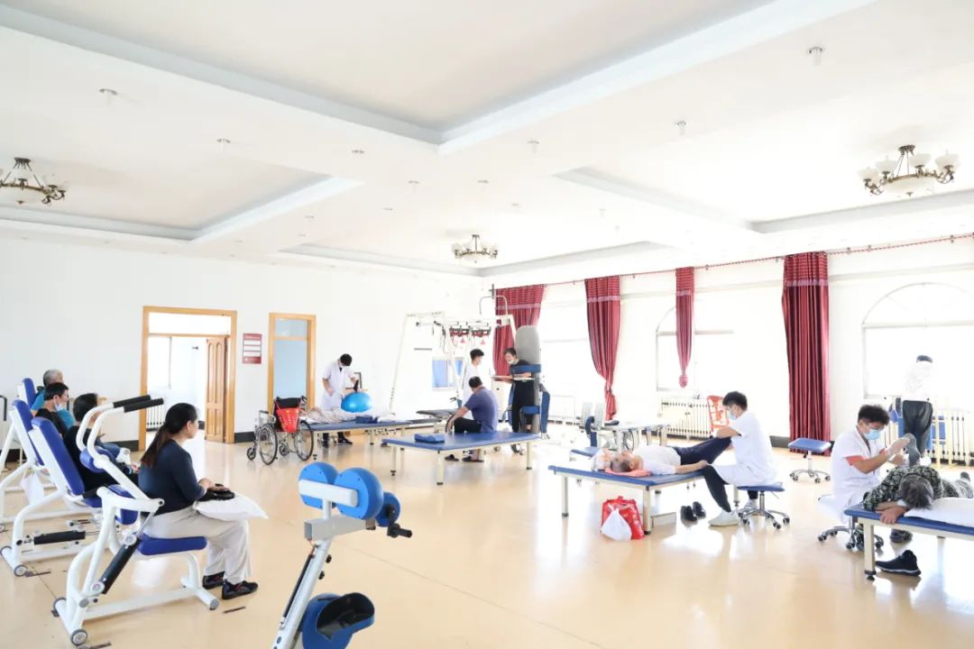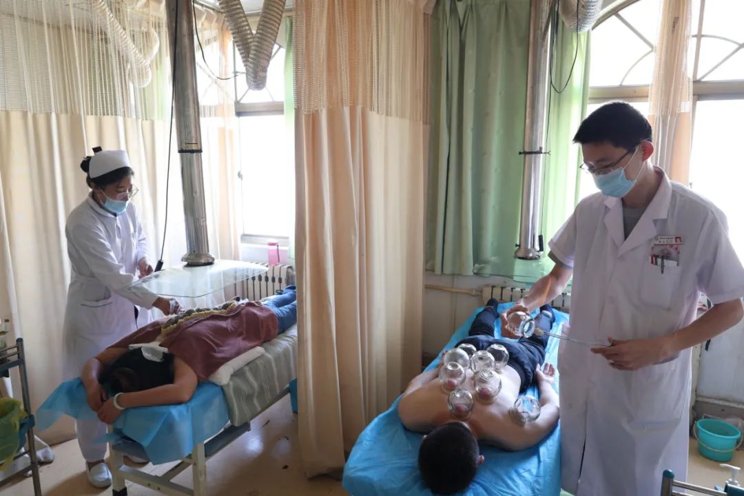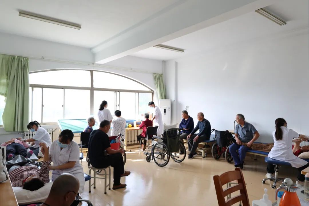 三楼治疗室里医师、护士正在为颈肩腰腿痛、中风偏瘫患者进行针刺、推拿、拔罐、灸法等中医特色外治疗法;五楼康复大厅里窗明几净,中风偏瘫患者接受康复治疗师耐心细致的治疗。