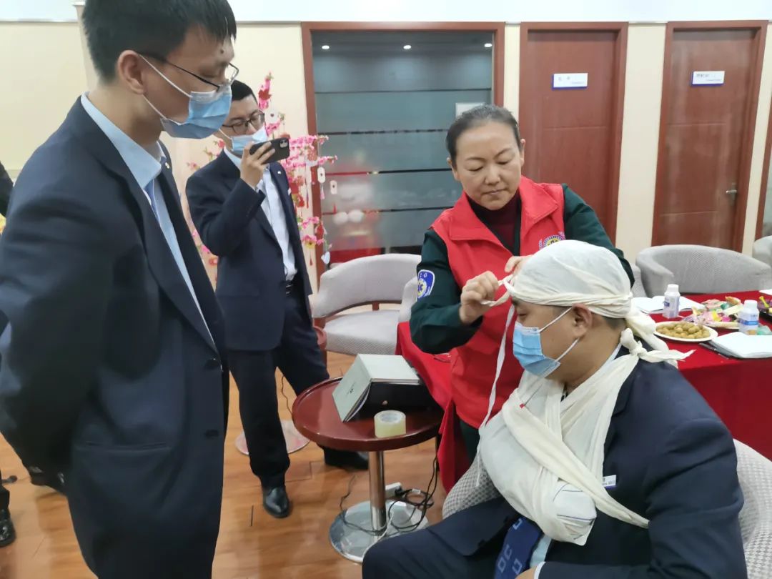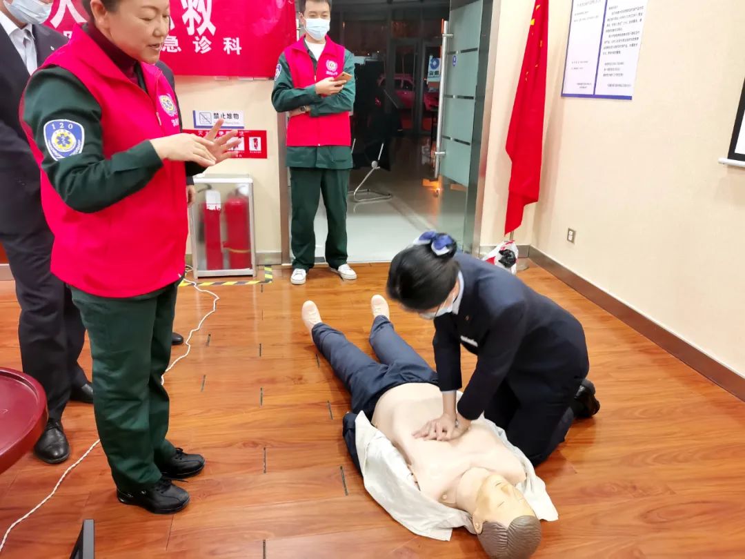 在技能操作指导阶段,李岩副主任医师、郭继臻医师通过现场示范教学,把急救要领、操作细节手把手的传授给现场人员,演习心肺复苏术,指导学习气道异物梗阻及止血包扎法等常用现场救护技能,大家踊跃参与,现场互动气氛热烈。