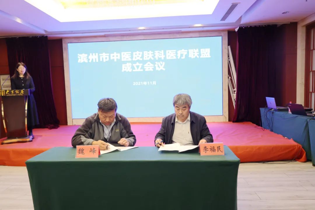 会议举行了隆重的签约和授牌仪式,会长单位滨州市中医医院李福民副院长分别同理事单位代表邹平市中医医院皮肤病医院魏峰副院长及惠民县中医医院牛佃堂院长签署联盟协议。滨州市中医医院党委书记张永生同志为各联盟单位授牌。