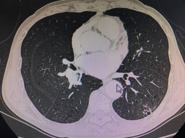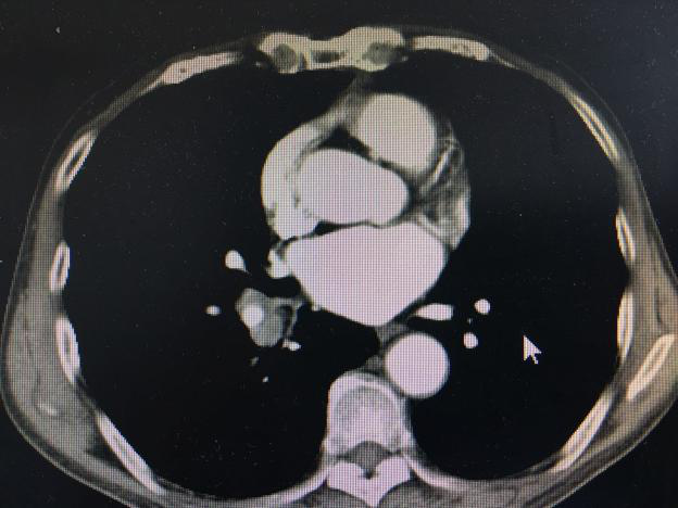 王大爷今年近80岁,因病住院,住院后行胸部强化CT提示右肺门占位:(见下图)