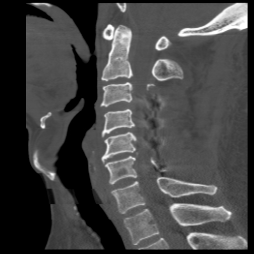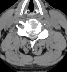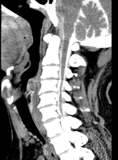 术前脊髓造影后CT,明显可见脊髓压迫