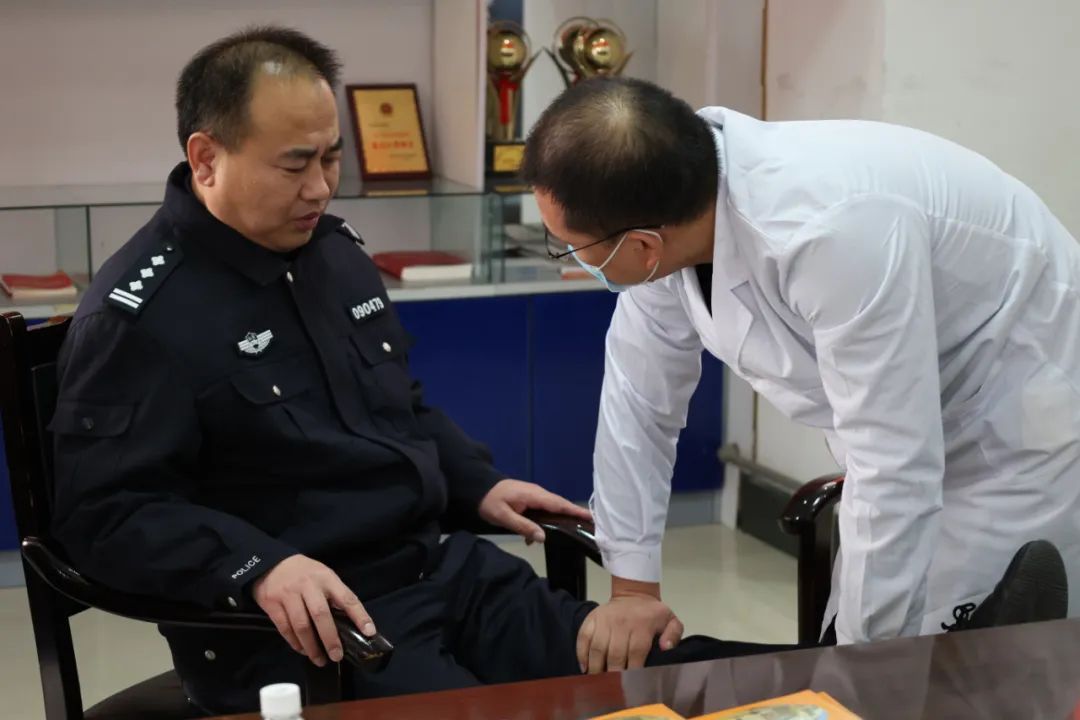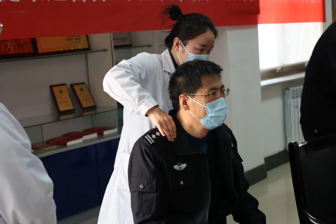 滨州市中医医院派出内分泌科(心脑血管病、呼吸科)、脾胃病科 、骨伤科 、推拿科、皮肤性病科十几名专家医护团队参与,为30余名警察提供了健康咨询、义诊查体、中医疗法等服务。有多年从医经验的中医专家吕振军主任和于得海主任为现场警察把脉问诊,开具良方,针对个体状况给出治疗建议。