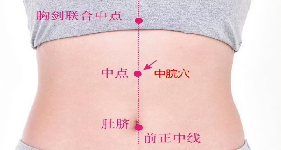 取穴:腹正中线上,脐上4寸,胸骨下缘与脐中连线的中点。
