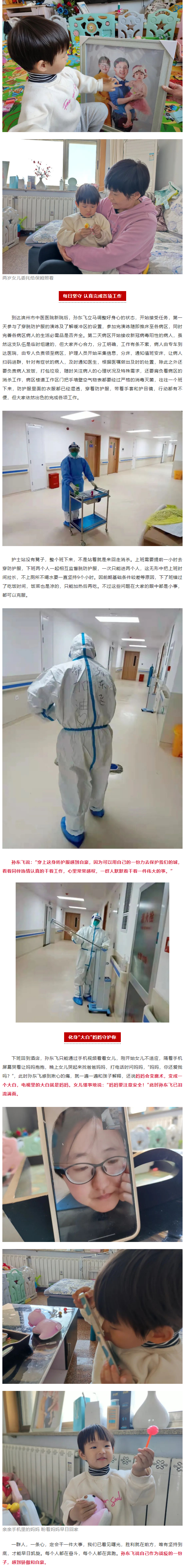 滨州疫情突然袭来,滨州市中医医院立即启动一支应急队前赴一线,自接收到组建应急队任务之时,内分泌科医护人员踊跃报名,其中有一个职工孙东飞的情况挺特殊,她家两岁的女儿无人照看,由于家庭情况特殊,家中老人三人早去世,还有一位年迈多病的老父亲,她的丈夫是一名人民老师,疫情发生后必须住在学校上网课,无奈她只好反复和保姆沟通,把两岁的女儿委托给了保姆24小时照看,毅然报名参加应急队。3月23日孙东飞接到通知就匆匆收拾了行李,跟孩子和保姆简单告别,没等孩子反应过来,就拿起行李赶赴滨州市中医医院新院区。家里只剩下孩子和保姆,孙东飞虽然心有万般不舍,但是医院有需要,我们就得挺身而出。