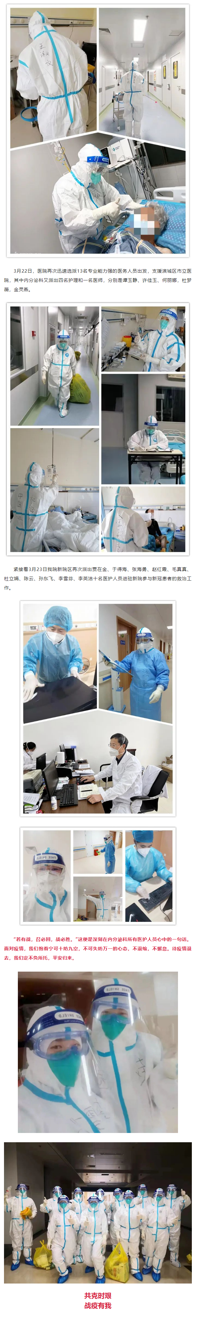 3月15日晚,医院紧急抽调11名医务人员前往滨城区市立医院支援。其中内分泌科有三人,分别是王淑文、楚云焕、尹霞,穿上了白衣,她们便是战士,不败疫情誓不回。