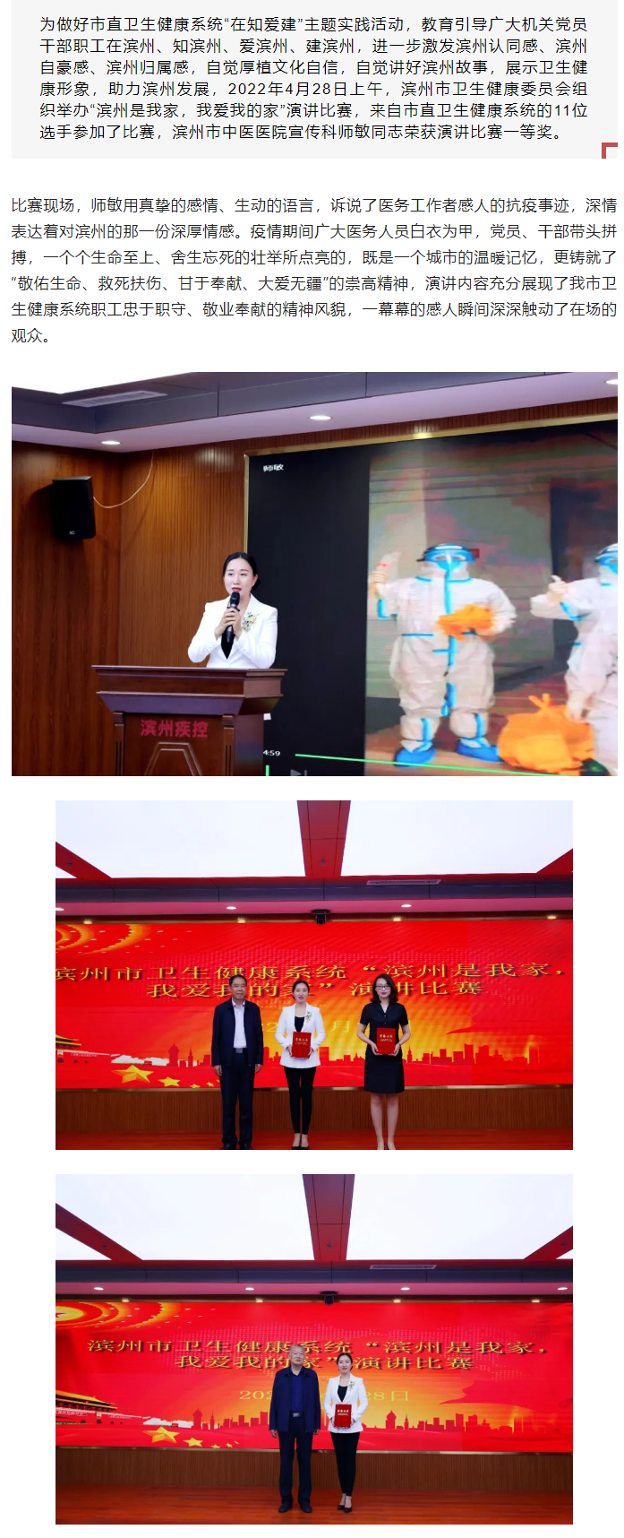 滨州市中医医院职工荣获市直卫生健康系统“滨州是我家,我爱我的家”演讲比赛一等奖