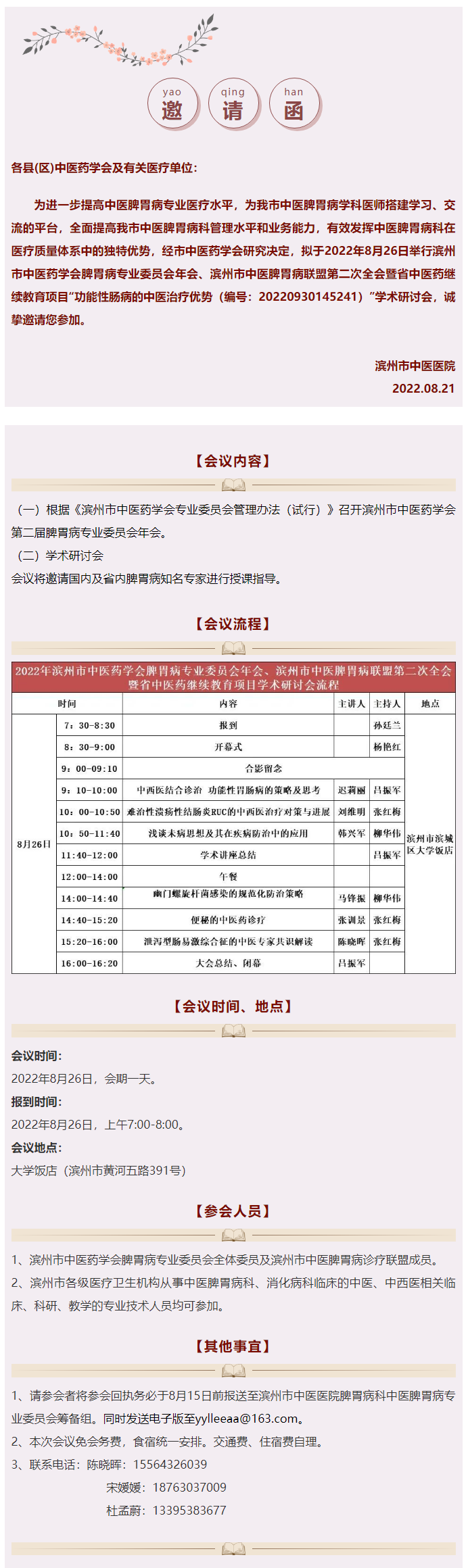 诚挚邀请 | 滨州市中医药学会脾胃病专业委员会年会、滨州市中医脾胃病联盟第二次全会暨省中医药继续教育项目学术研讨会邀请函
