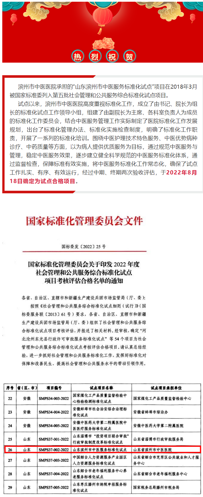 热烈祝贺“山东滨州市中医服务标准化试点项目”被国家标准化管理委员会确定为考核评估合格项目