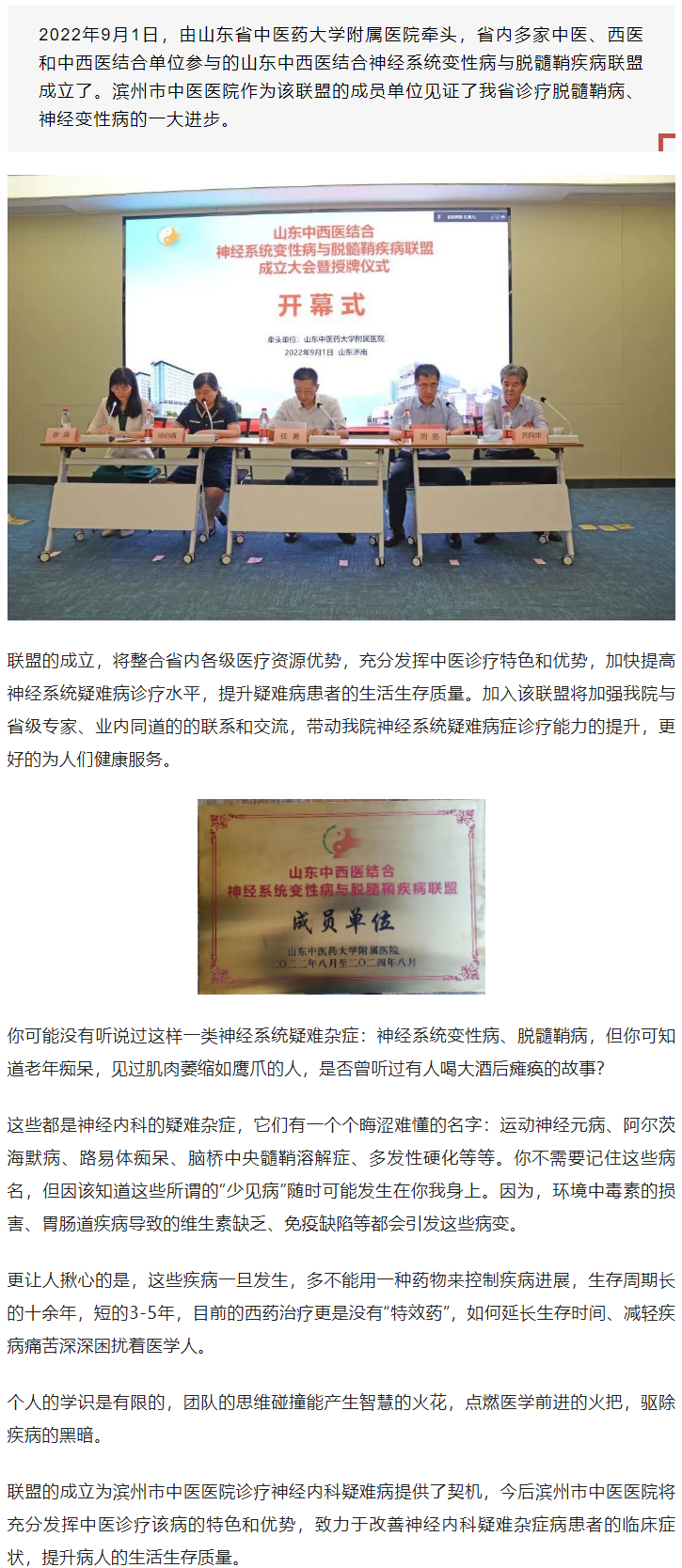 神经内科疑难病治疗新希望——滨州市中医医院加入山东中西医结合神经系统变性病与脱髓鞘疾病联盟