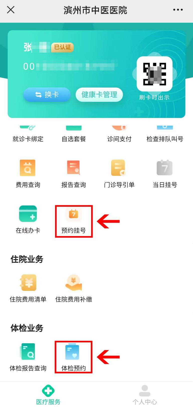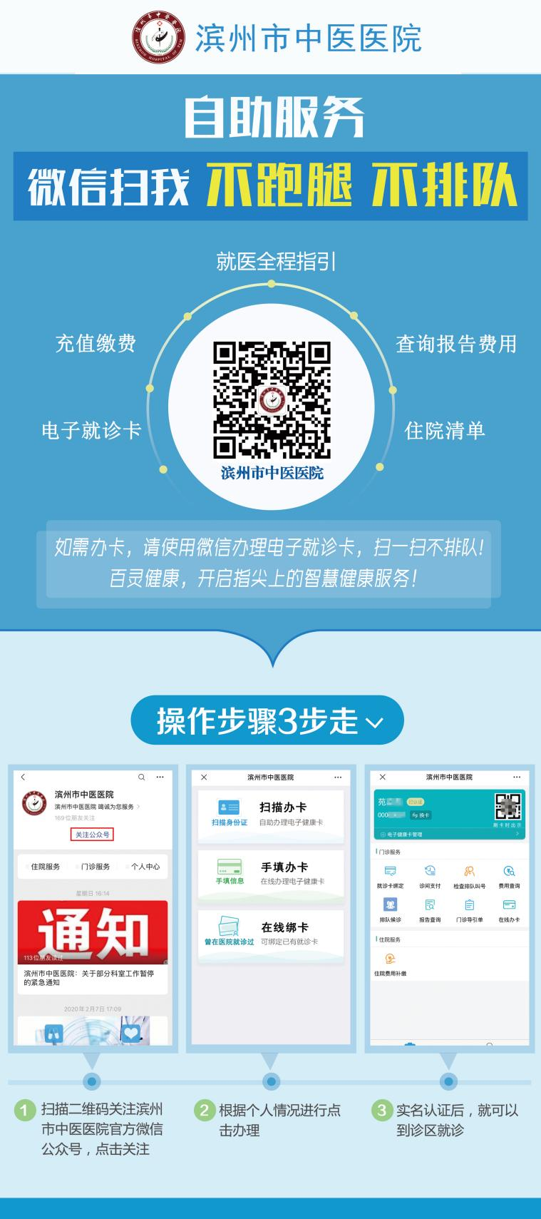 电子就诊卡可微信搜索“滨州市中医医院”公众号进行关注办理,办理成功后,到相关门诊出示二维码即可扫描就诊。