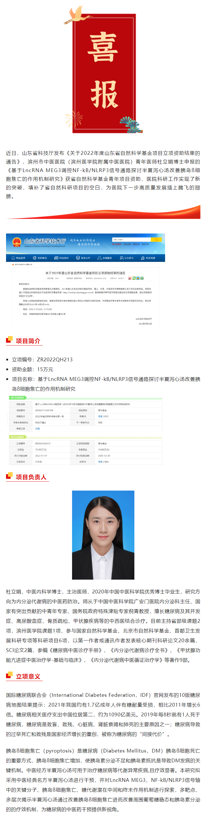 喜报 | 滨州市中医医院(滨州医学院附属中医医院)青年博士杜立娟获批立项省自然科学基金项目