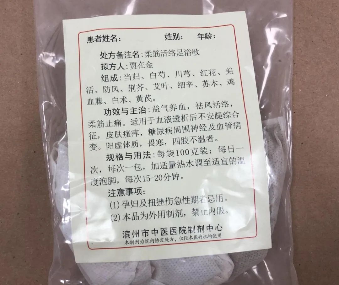 透析患者是一个特殊的群体,对于他们来说最难忘的莫过于一年中风雨无阻的无数个透析日。不安腿综合症、失眠、心悸、皮肤瘙痒等症状严重困扰着患者。科室贾在金主任心系患者,每日诊查患者身体状况,结合临床症状和中医辩证论治,研制出了柔筋活络足浴包,患者应用后疗效显著。”自从应用了贾主任的柔筋活络足浴包,坚持每晚泡脚,腿不疼了,晚上也能睡整夜觉了”,来自惠民的透析患者路老师说。
