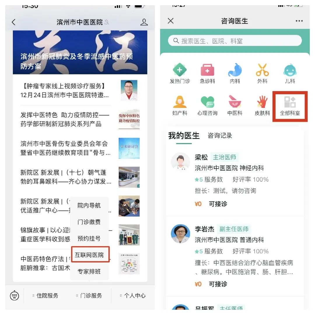选择“门诊服务”中的“互联网医院”。选择“全部科室”,按科室或者医生进行问诊。