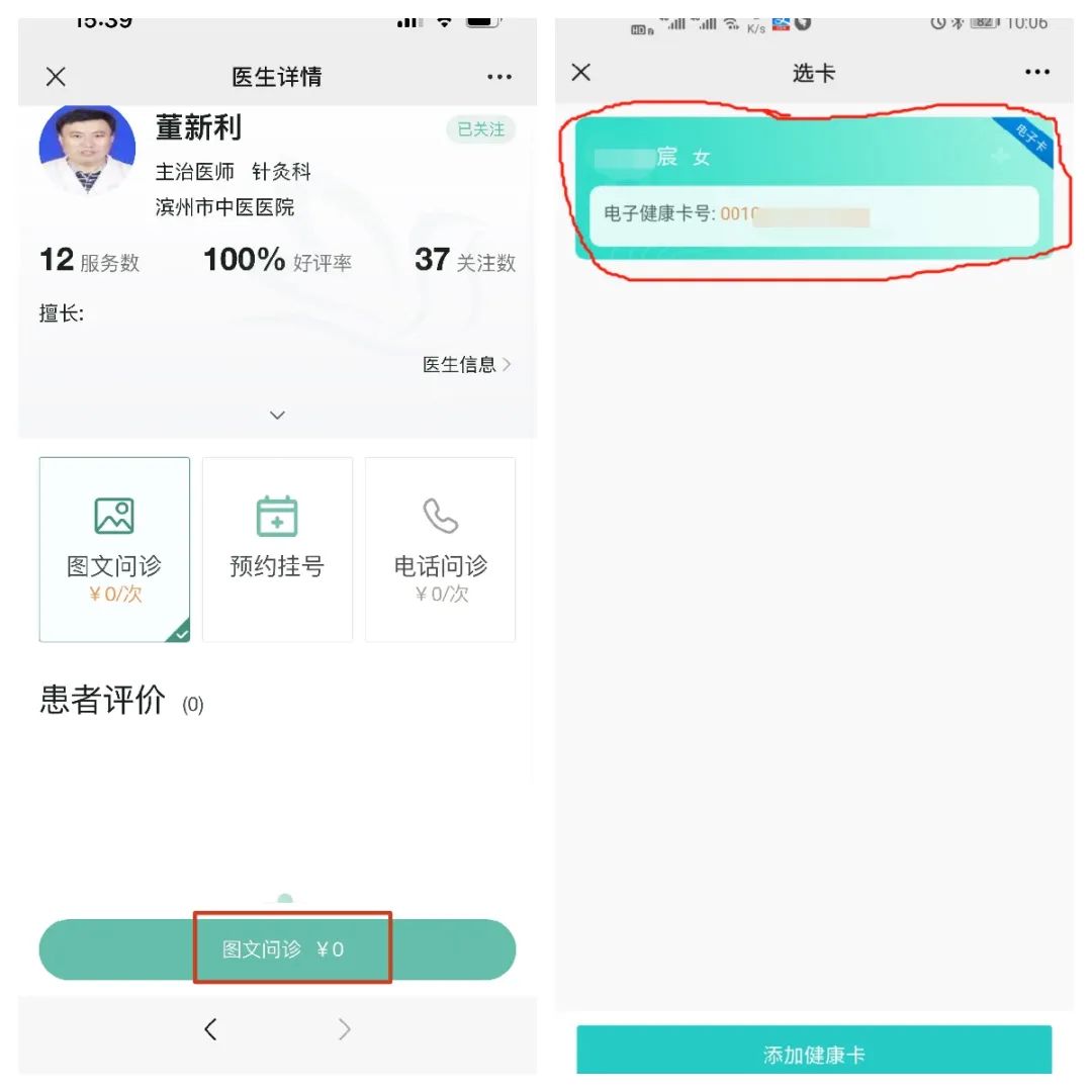 选中“图文问诊”,点击下方“图文问诊”按钮。选择就诊病人,点击红色圈中的就诊人。如果第一次就诊,则需要先添加就诊人。