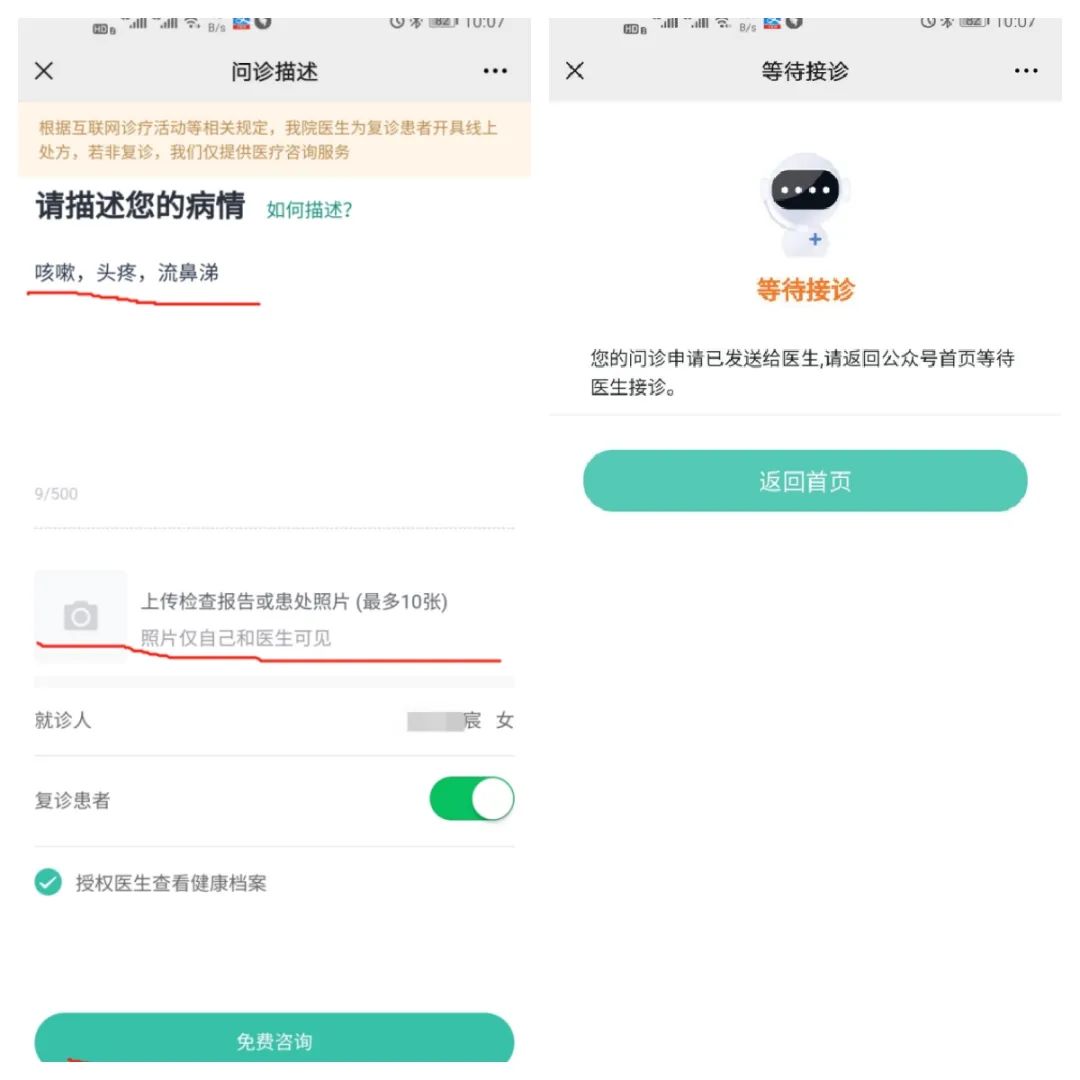 进行病情描述,说明自己要购买的药品,可拍照上传药品信息。信息填写完毕后点击“免费咨询”。等待医生接诊,医生接诊并开出药方后,在微信公众号中出现待缴费提醒消息。慢性病患者开慢性病药品请告知接诊大夫。