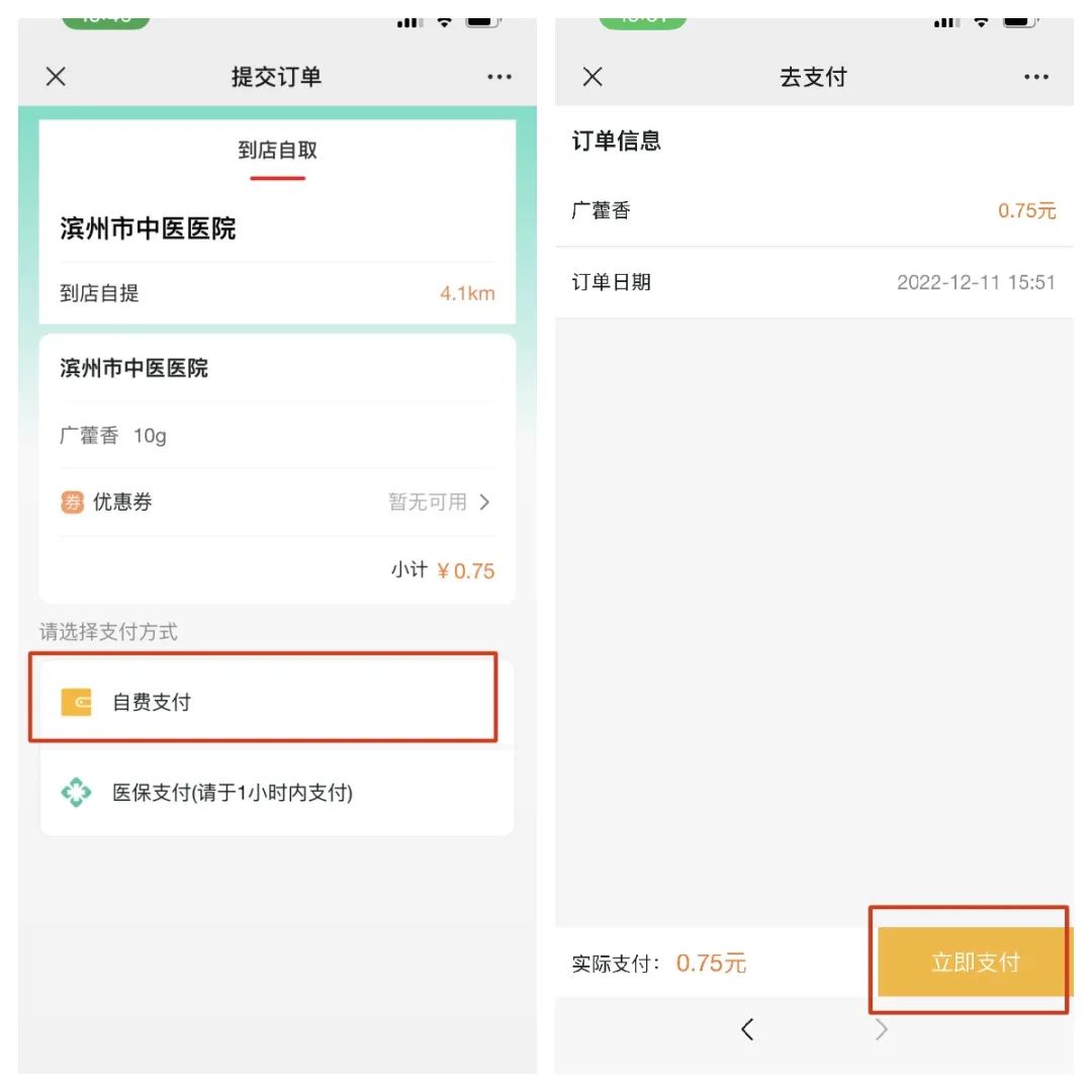 支付方式选择自费支付,点击立即支付,进行微信支付。