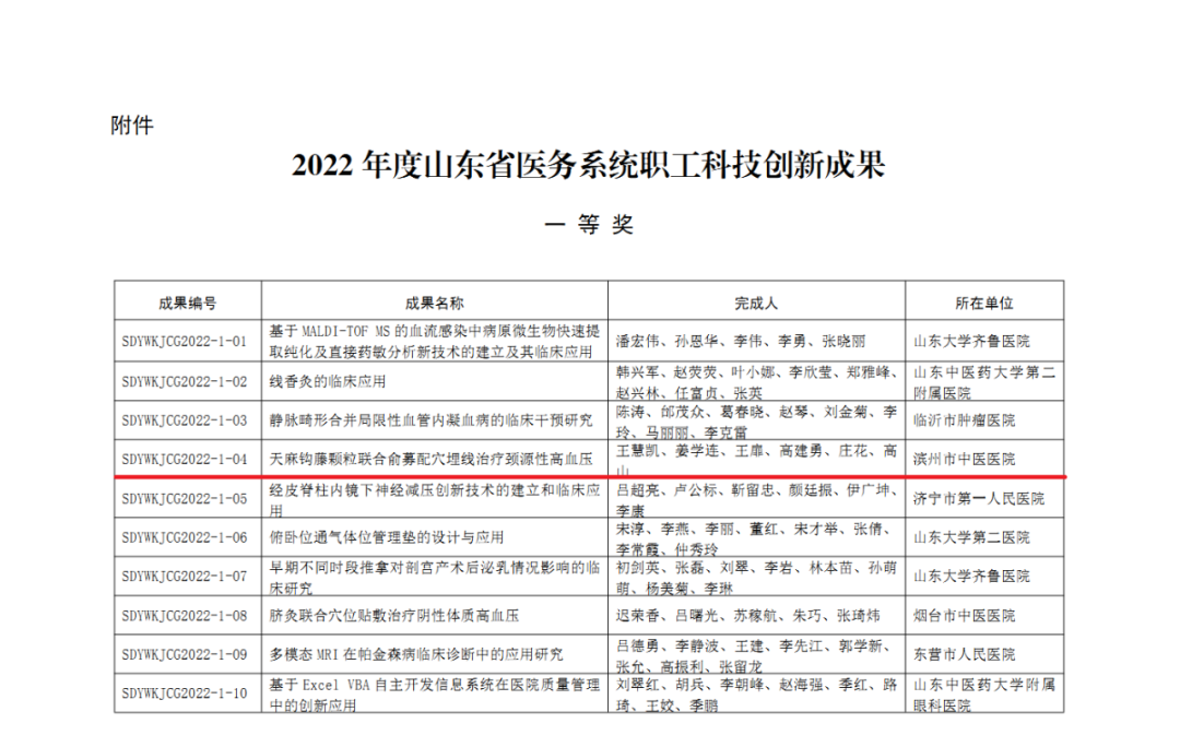 滨州市中医医院(滨州医学院附属中医医院)成果获山东省医务系统职工科技创新成果一等奖