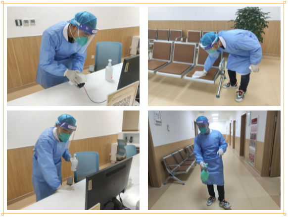 近期,解玉龙先后两次在超声医学科培训穿脱防护服,他讲解细致、操作规范,超声医学科全体人员受益颇丰。他和吴永见、侯若楠三人主动承担起了科室的消杀工作。他们每天用消毒湿巾擦拭高频接触面,每天择机喷洒84消毒液为地面消毒,下班前及时清理医疗垃圾,中午和晚上下班后立刻打开紫外线灯消毒,他们共同为我们创造了安全、舒适的工作环境。