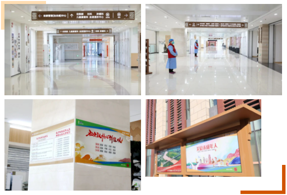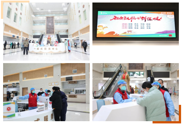 宽敞明亮的门诊大厅内,大屏幕上播放着创建文明城市的公益广告,身穿红马甲的志愿者热情引导患者文明有序就诊,提醒保持一米线距离取药缴费,大厅内就医秩序井然有序。医院设有母婴室和无障碍卫生间,方便有需要的人群使用,体现了医院的人文气息。