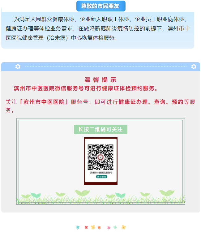 滨州市中医医院体检业务已恢复 办理健康证需提前微信预约