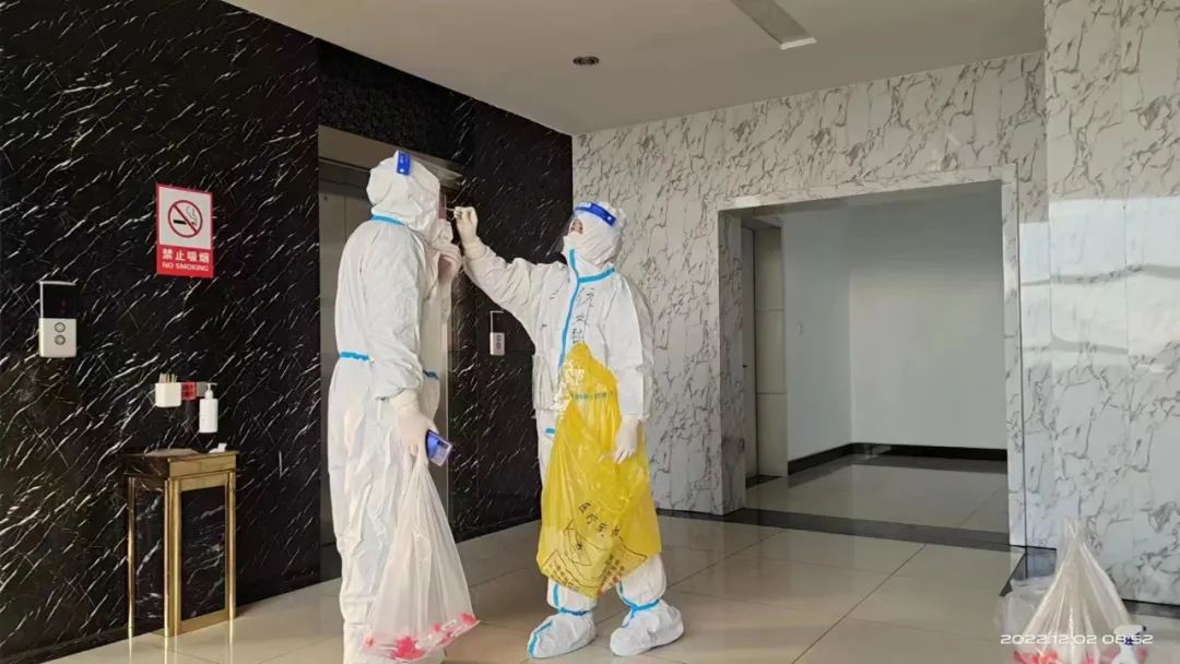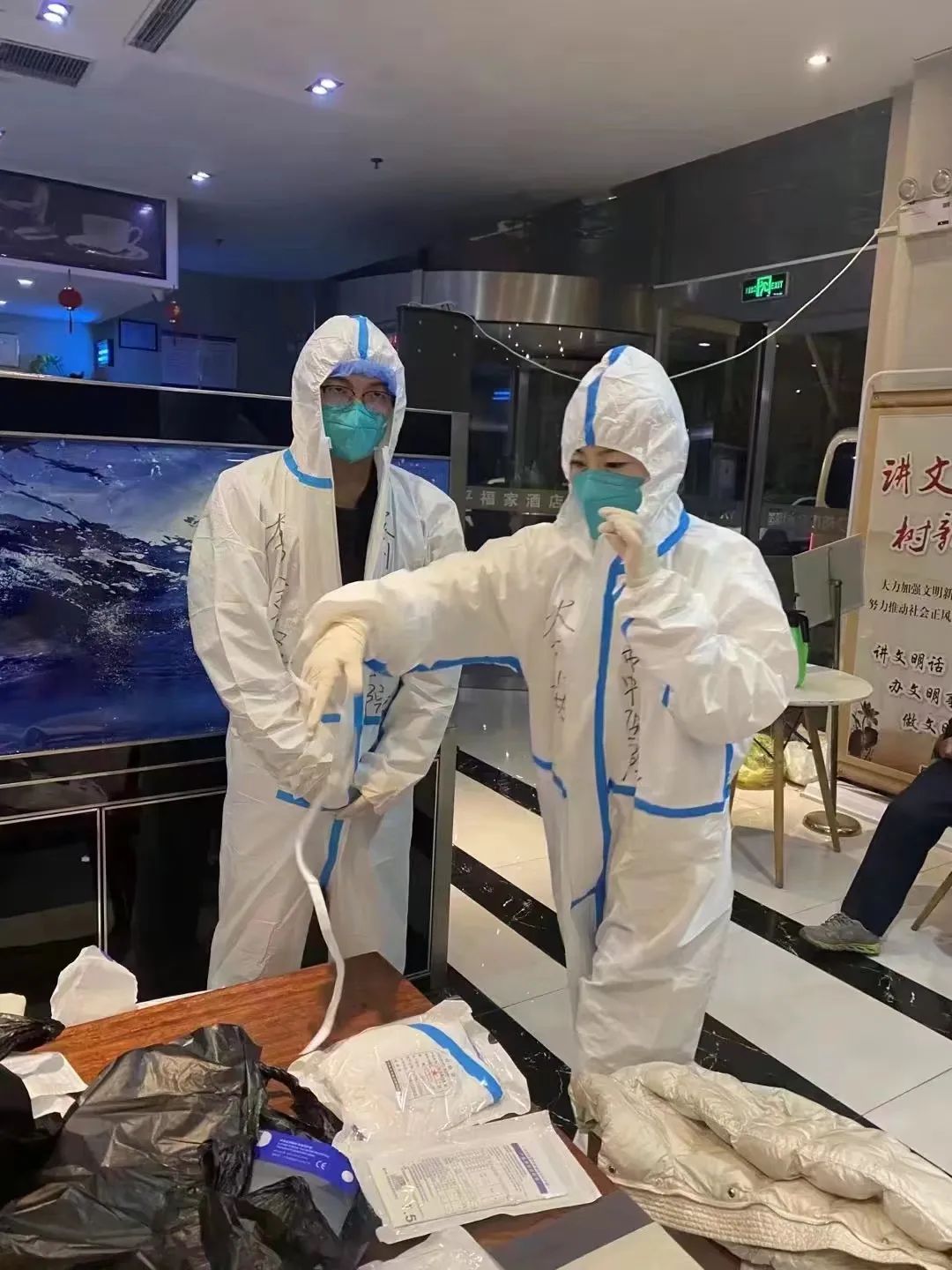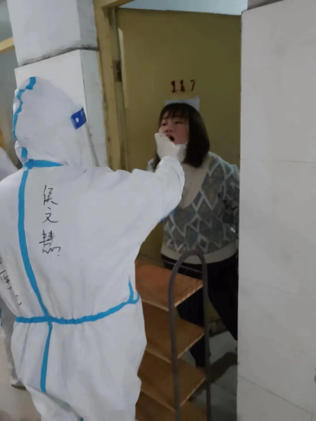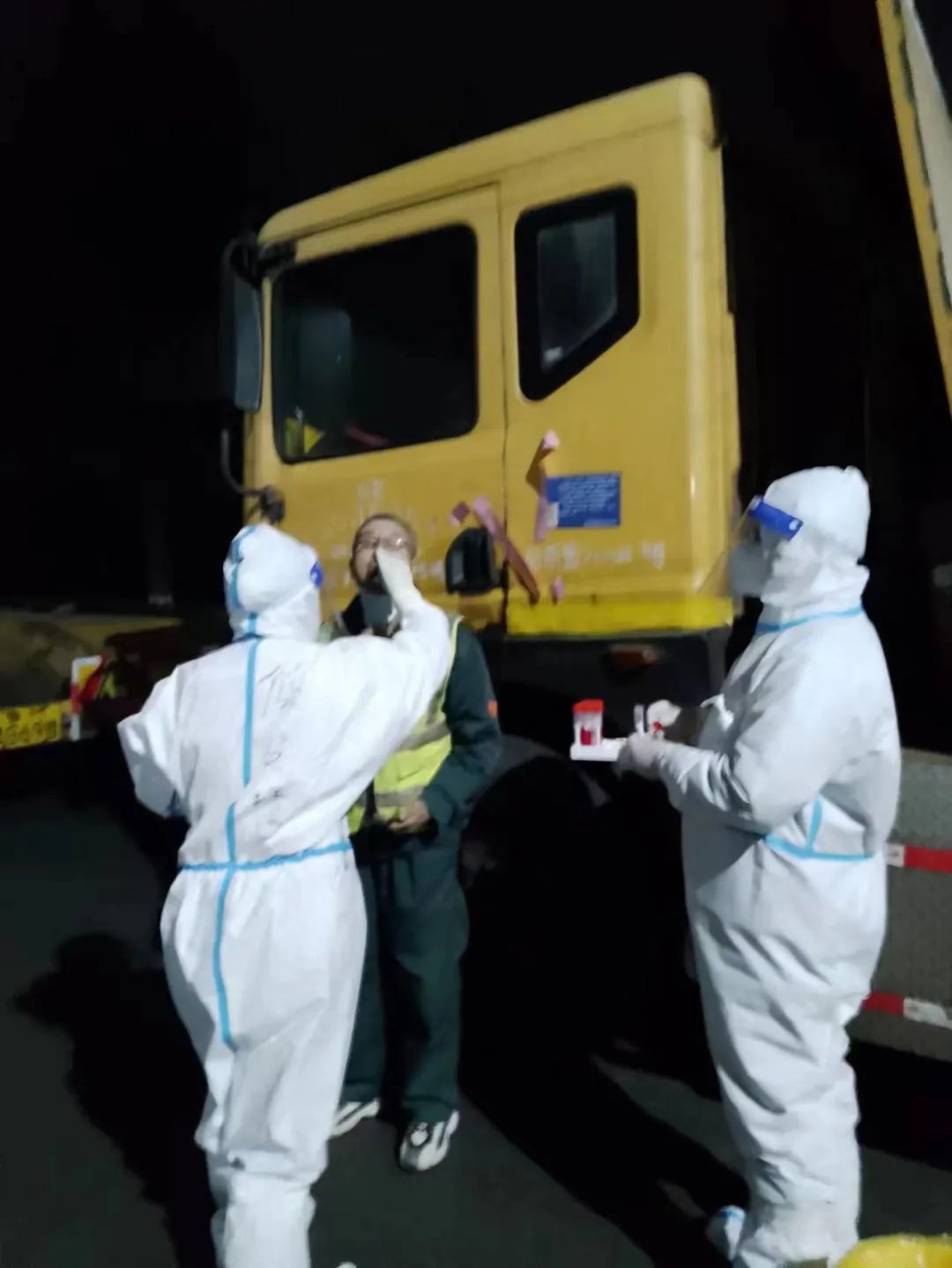 11月25日晚22时支援队伍整装出发,赶往邹平的途中接到核酸采样紧急任务,来不及放下行李,支援队伍直接前往现场进行全员核酸检测。负责执行流动采样工作的小组成员,在寒风中坐着电动三轮车在诺大的厂区内穿梭奔波进行采样工作;负责静止人员采样工作的小组成员,每层每户挨个敲门进行单人单管采样工作;负责给静止的大车司机采样的人员穿着笨重的防护服步行并爬到汽车车窗位置进行采样。为了减少脱防护服过程对周围环境的污染,全体成员忍着严寒在室外空旷地带脱防护服并打包处理。凌晨4时,采样队成员才带着行李箱拖着沉重的步伐回到酒店。