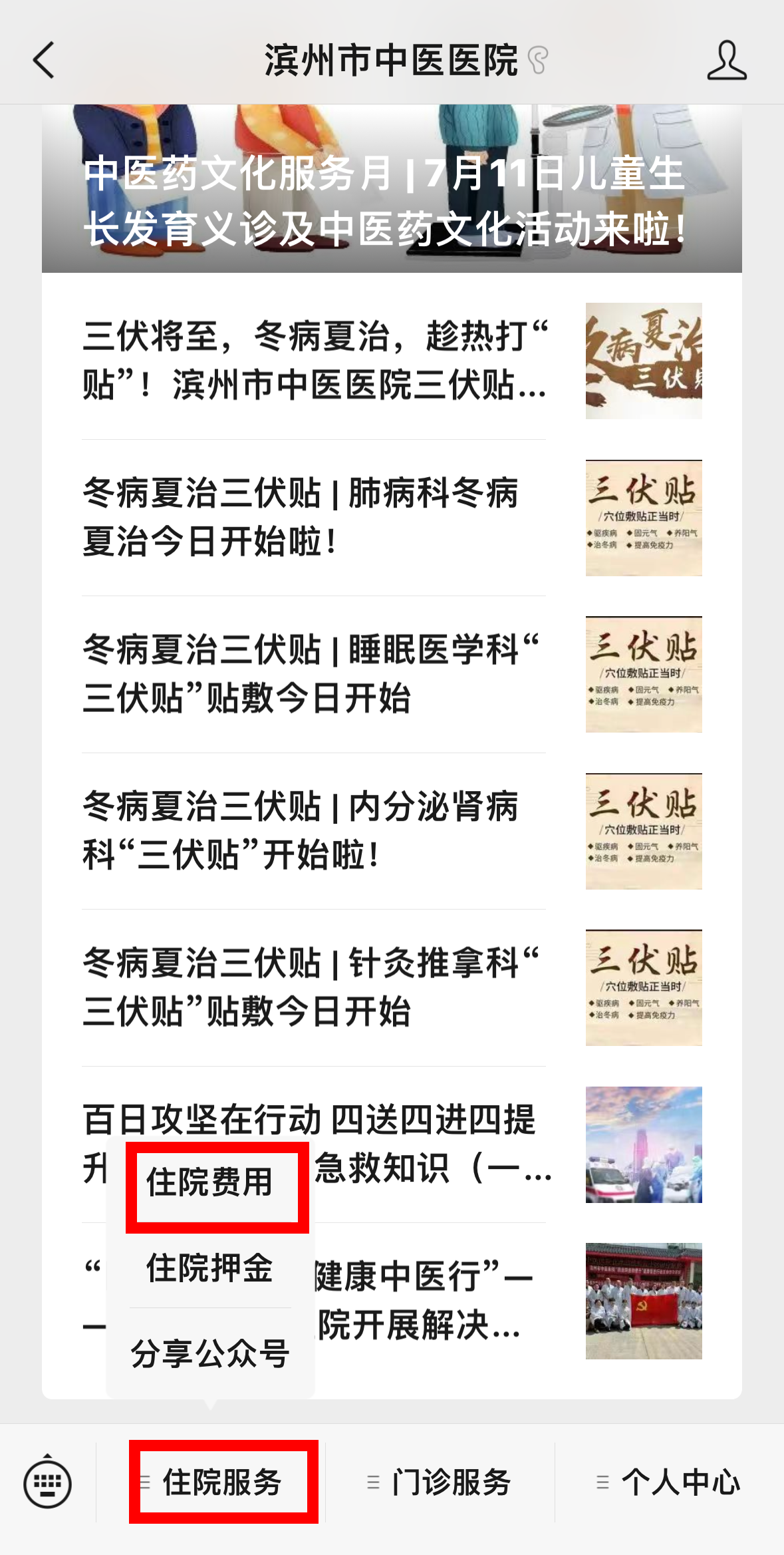 移动端:微信公众号搜“滨州市中医医院”公众号并关注---个人中心---医疗服务----费用查询