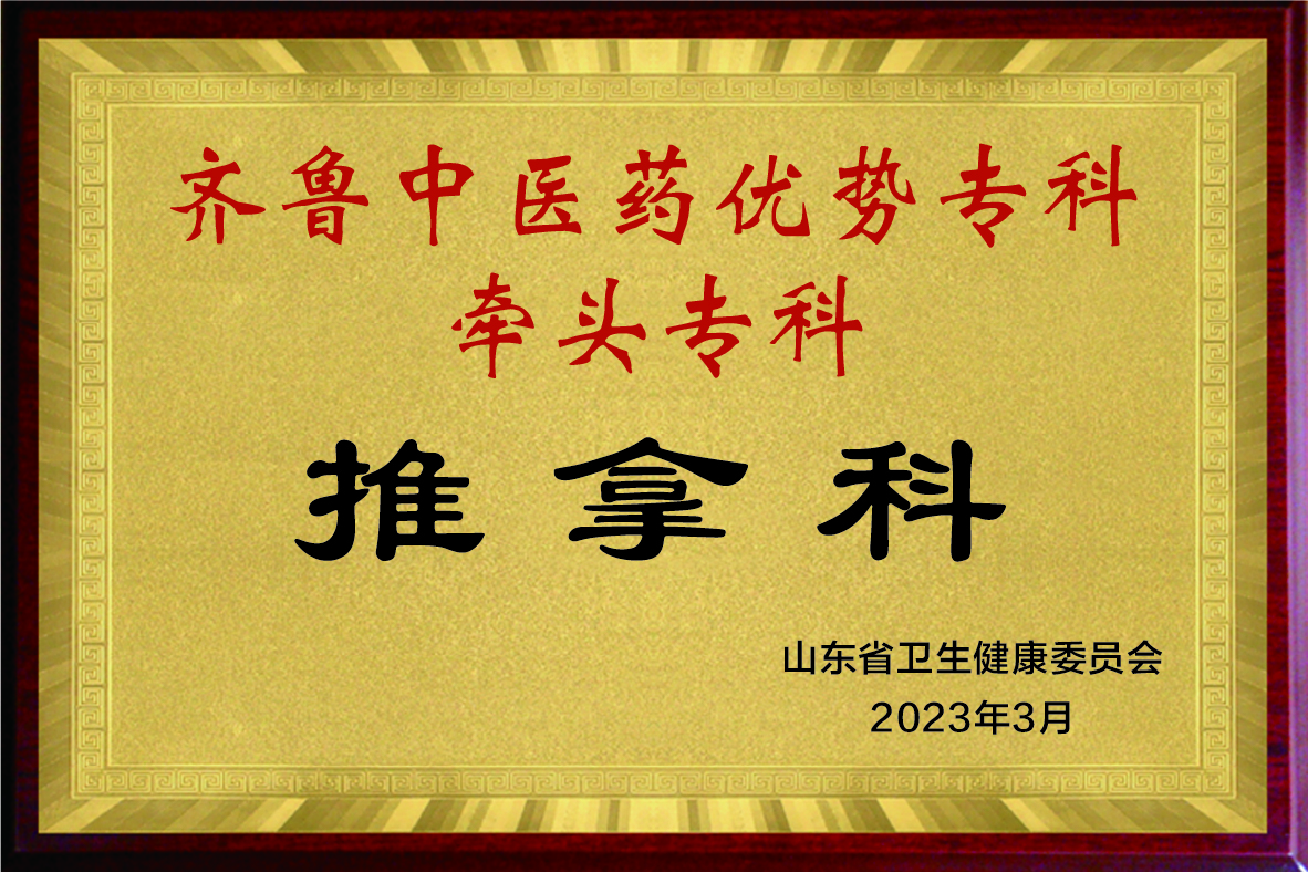 滨州市中医医院推拿科,成立于1984年,是我院支柱科室和特色科室,2009年以"椎间盘突出专科"被评为山东省重点专病专科,2021年被评为山东省中医重点临床专科,是全国推拿重点专科的协作组单位。2022年当选滨州市中医推拿优势专科集群牵头专科,2023年当选齐鲁中医药优势专科集群推拿2群牵头专科。科室现分为推拿一科、推拿二科、推拿三科,开放床位100张,本科室现有医护人员63人,其中山东省名中医药专家3人,硕士研究生10余人,高、中、青人才梯队合理。年门诊量3万余人次,住院病人3000人次。