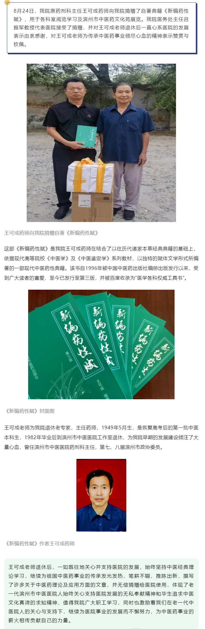 中医经典薪火传,推陈出新赠佳篇——我院退休老专家王可成药师为医院捐赠自著典籍《新编药性赋》