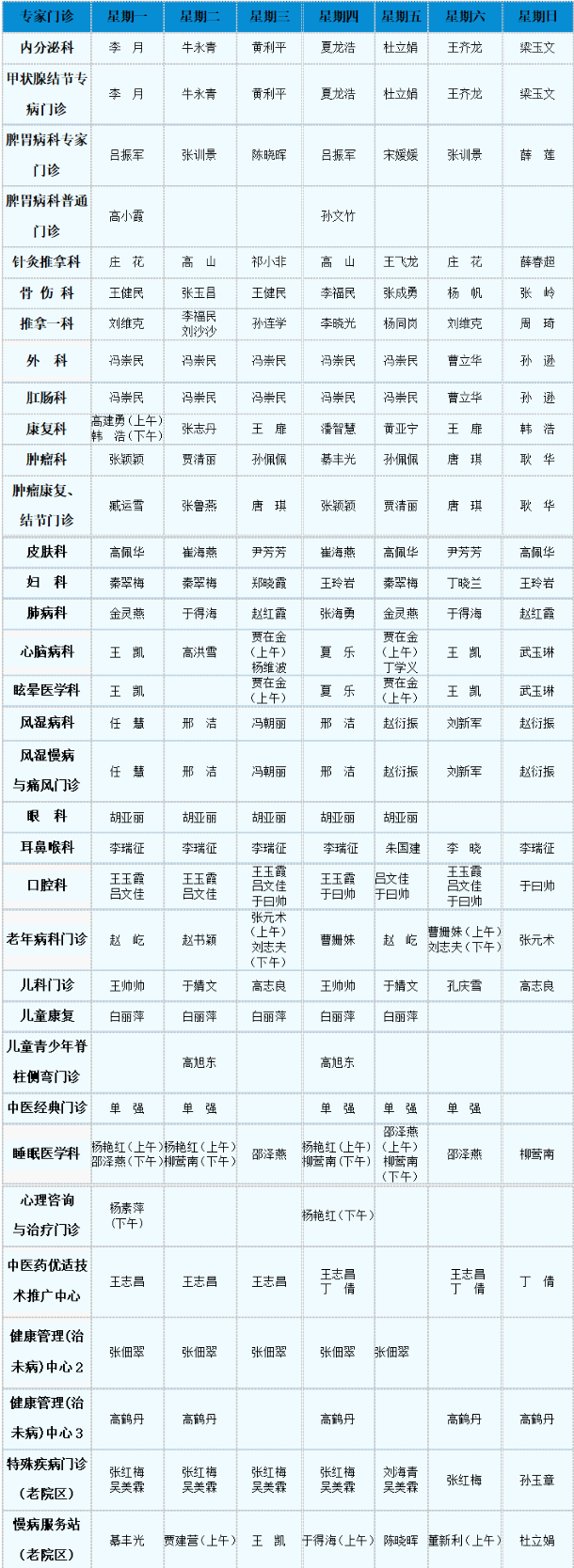 中医专家门诊值班表
