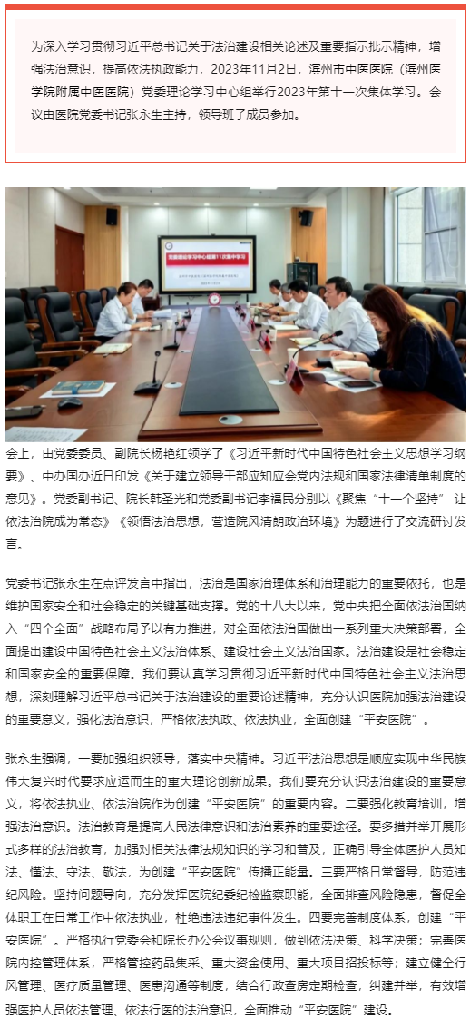 加强法治建设 创建“平安医院”——滨州市中医医院(滨州医学院附属中医医院)党委理论学习中心组举行2023年第十一次集体学习